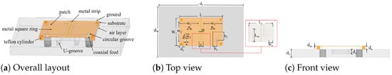 To achieve frequency diversity, the geometry of the DDPA designed in this paper is illustrated in Figure 3. The front view is shown in Figure 3c, where an air layer of thickness is placed between a Rogers 4003 dielectric substrate of thickness (relative permittivity of 3.55 and loss tangent of 0.0027) and a ground plane of thickness . A U-shaped slot of thickness d is etched from the interface between the ground plane and the air layer.