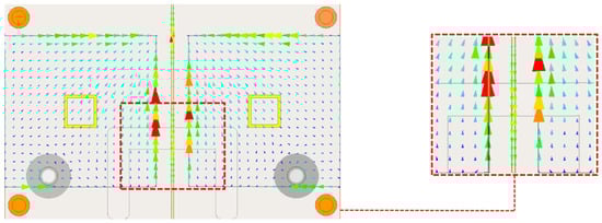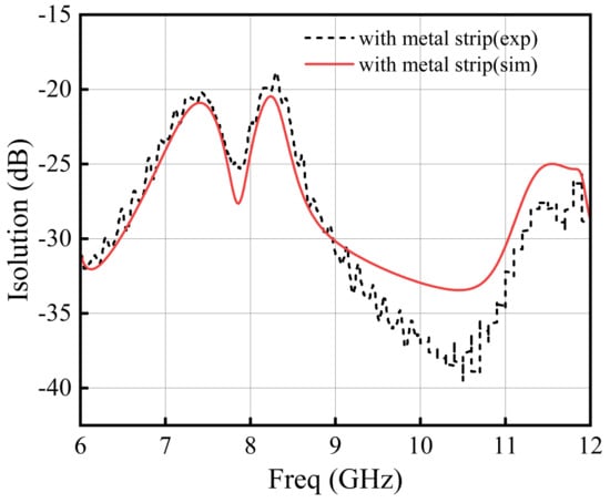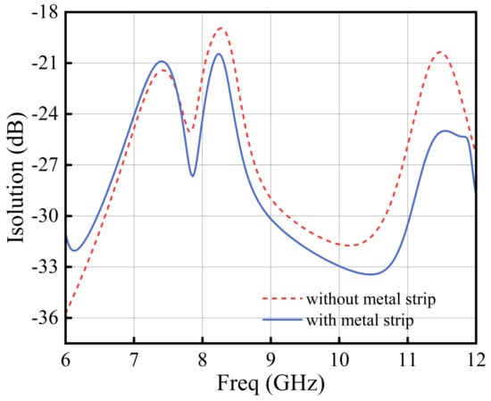 In addition, due to multimode resonance, the induced current coupled to the metal strip exhibits two opposite current directions. The current flowing in the lower portion of the patch is opposite to that at the patch edge, resulting in partial cancellation between the electromagnetic fields generated by the metal strip and those produced by the patch. This effect slightly reduces the isolation between the two feed ports, as illustrated in Figure 8, where the patch spacing is 3 mm (). The simulated results shown in Figure 8 confirm that the overall isolation performance is improved after introducing the metal strip.