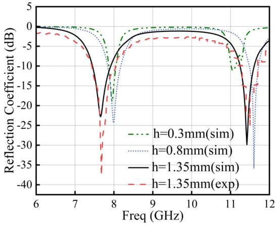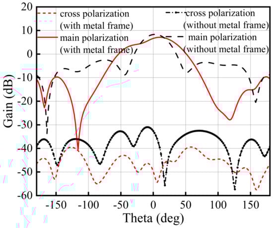 In addition, since the dielectric constant of the air layer is and that of the Rogers RO4003 substrate is 3.55, the introduction of the air layer effectively reduces the overall equivalent dielectric constant. This reduction smooths the input impedance curve of the antenna and improves its impedance bandwidth. In the proposed structure, the two signals from the dual-phase centers are designed to be orthogonal in polarization, as illustrated in Figure 4. The current on the upper-left patch flows at an angle of 45° to the right, whereas that on the upper-right patch flows at an angle of 45° to the left, forming an orthogonal polarization with a 90° separation between them. The antenna was simulated using *Ansys HFSS* software, and the results are presented in Figure 5. As the height of the air layer increases from 0.3 mm to 1.35 mm, the bandwidths of the two operating frequency bands increase by 430 MHz and 450 MHz. Consequently, two operating bands are obtained, centered at 7.3 GHz and 11.2 GHz, with bandwidths of 610 MHz and 580 MHz, respectively. The red dashed line in Figure 5 represents the measured reflection coefficient. The experimental results show good agreement with the simulations, confirming the accuracy of the antenna fabrication and design. To satisfy the spatial and temporal independence requirements of the emitted signals in RCI, it is essential to minimize the mutual interference between the signals radiated by the two phase centers while simultaneously acquiring more target information. A metal frame with a width of 0.125 mm is placed on the back of each patch. This frame acts as a reflector, redirecting the backward electromagnetic waves toward the front of the antenna. As a result, the radiated energy becomes more concentrated along the main radiation direction, reducing energy scattering in the cross-polarization direction and thereby suppressing cross-polarization components. The black solid line in Figure 6 represents the main-polarization radiation without the metal frame, with a gain of 8.53 dB, whereas the black dashed line shows the orthogonally polarized radiation without the frame, with a gain of 40.93 dB. The red solid line in Figure 6 corresponds to the main-polarization radiation with the metal frame. Since the electromagnetic wave reflected from the metallic frame also contributes to the co-polarization component, the overall radiation gain decreases by 1.54 dB (from 8.53 dB to 6.99 dB), whereas cross-polarization isolation improves by 15.46 dB, reaching 50.93 dB.