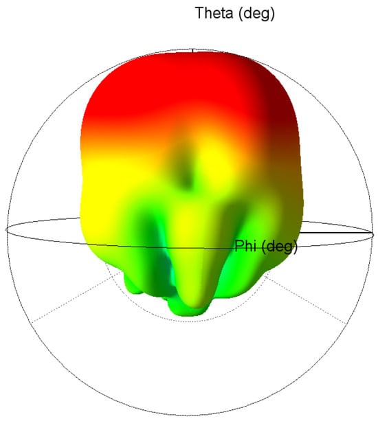 The gain of the DDPA was measured in a microwave anechoic chamber. The measured peak gain of the DDPA is 6.7 dB, with a cross-polarization isolation of 47.55 dB. The experimental results are in good agreement with the simulations, confirming the effectiveness of the proposed design. Under these conditions, mutual interference between the two polarized signals is minimized. Consequently, when one feed port is used for the main polarization, the other corresponds to the cross polarization. In Figure 6, the main and cross-polarizations represent the horizontal and vertical polarizations, respectively.Since the two patch antennas in the DDPA are mirror-symmetric, each feed port excites a different polarization. When the horizontal (vertical) polarization port is excited, the main polarization in Figure 6 corresponds to the horizontal (vertical) polarization, while the cross-polarization corresponds to the vertical (horizontal) polarization. The beamwidth is approximately , and the sidelobe level is about . The three-dimensional radiation pattern of the DDPA is shown in Figure 7.