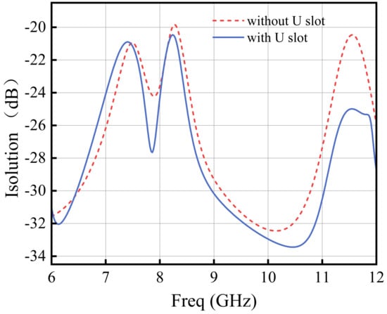 To further improve the isolation, a U-shaped slot was etched into the ground plane. The introduction of an air layer reduces the propagation of the electromagnetic field within the dielectric substrate. When electromagnetic waves propagate from a medium with a higher dielectric constant to an air layer with a lower dielectric constant, stronger reflections and higher impedance occur. The U-shaped slot causes the electric field to concentrate locally near the slot edges, thereby increasing the impedance. As a result, the electromagnetic waves traveling from one patch to the other are more strongly reflected, which reduces mutual coupling. In addition, the U-shaped slot alters the current distribution between the ground plane and the dielectric substrate, introducing diffraction and scattering effects along the slot boundaries. This modification lengthens and redistributes the current paths, thereby reducing the direct coupling of electromagnetic energy between the two feed ports, as illustrated in Figure 9. Figure 10 presents a comparison of the simulated and measured port isolations, showing good agreement between the two results and confirming the effectiveness of the proposed isolation design.