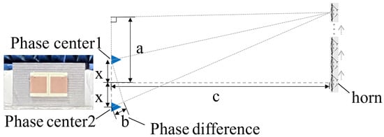 The phase difference (in degrees) was recorded each time using a vector network analyzer inside the anechoic chamber, and the corresponding phase difference b (in centimeters) between the two phase centers after each movement was calculated according to (34). The experimental setup is illustrated in Figure 11. The blue triangles represent the two phase centers. Here, a denotes the displacement of the horn antenna, c represents the horizontal distance from the midpoint of the line connecting the two phase centers to the horn motion plane, and b is the phase difference measured between the two ports.