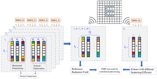 Each DDPA has two feed ports, indicated by the orange arrows in the Figure 14, and each port corresponds to a specific polarization. The symbol “−” denotes horizontal polarization, whereas “⊥” represents vertical polarization. As illustrated in the Figure 14, each orange arrow indicates a single-polarization random signal. The results from the four antennas correspond to the four gray boxes, which are directly superimposed in the imaging process. Each small grid in the imaging area corresponds to a scattering unit denoted as .