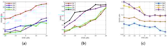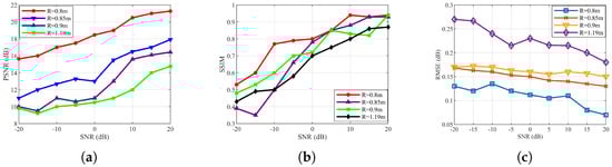 The quantitative evaluation further confirms this trend. PSNR increases monotonically with SNR and maintains a clear separation among different imaging distances. Specifically, the case of achieves the highest PSNR (exceeding 20 dB in the high-SNR region), followed by and , while yields the lowest PSNR (slightly above 10 dB in the low-SNR region). This indicates that a shorter imaging distance mitigates noise amplification and distortion accumulation.
