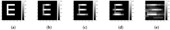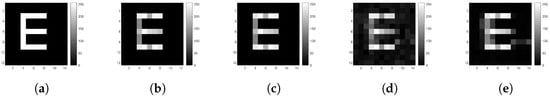 As shown in Figure 17 and Figure 18, imaging quality depends jointly on imaging distance R and the SNR. When , the reconstructed letter “E” exhibits clear strokes and high contrast. As the imaging distance increases to , , and , the image edges gradually become blurred, blocky artifacts appear, and fine structural details and hierarchical information are lost.