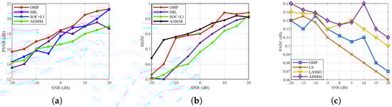 As shown in Figure 19 and Figure 20, different reconstruction methods exhibit consistent trends in both visual performance and quantitative metrics, though with varying degrees of improvement. Subjectively, the image reconstructed using the orthogonal matching pursuit () method displays the most complete and high-contrast letter “E,” characterized by sharp edges and smooth texture transitions. OMP achieves fast convergence when the sparsity and low-coherence conditions are met. The sparse Bayesian learning () method recovers the overall outline but produces an over-smoothed and slightly blurred image with lower contrast in fine details. The second-order correlation plus -norm () method, influenced by sparse regularization, introduces blocky or stair-step artifacts and discontinuities in fine structures. The alternating direction method of multipliers () achieves the best noise suppression, yielding fewer speckles and better structural preservation, although slight over-smoothing remains noticeable at very low SNR levels.