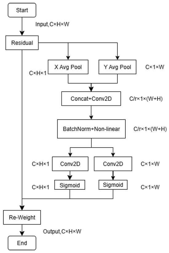 - Attention Map Construction and Feature Recalibration [17,18]:The intermediate feature f can be split along the horizontal and vertical dimensions into and , respectively. Two separate convolution, are applied to generate the corresponding attention weights along the horizontal and vertical directions. This operation can be expressed as:where and stands for convolution, they are used to transform and back to C channels (same channel number as input) and generate attention map along height (denote as ) and width (denote as ) direction.Finally, the computed attention weights are applied to the original feature map through element-wise multiplication, producing a refined feature map of dimensions C × H × W that emphasizes critical regions more effectively. This operation can be expressed as:where denotes the new feature map after applying coordinate attention, while represents the original feature map. It is evident that the dimension of the feature map remains unchanged after introducing coordinate attention, while the local details within the feature map are selectively enhanced.