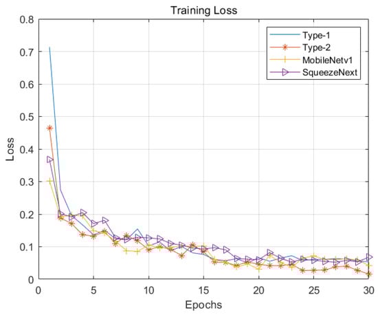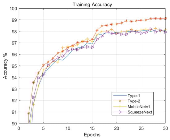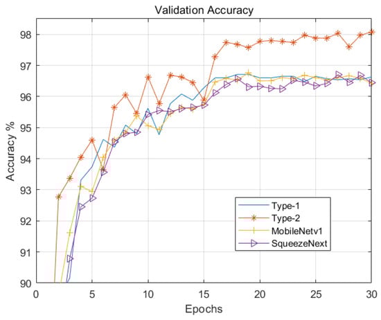 Figure 4 and Figure 5 illustrate the loss curves of the four models on the training dataset and validation dataset, respectively. Figure 6 and Figure 7 illustrate the accuracy curves of the four models on the training dataset and validation dataset, respectively. As shown, the Type-2 model—enhanced with the coordinate attention mechanism—demonstrates slightly better performance than Type-1 in both loss reduction and accuracy. MobileNetV1 and SqueezeNext exhibit comparable performance to Type-1; however, their model sizes are significantly larger, at 12.6 MB and 2.6 MB respectively, compared to just 400 KB for Type-2. Additionally, a noticeable rise in accuracy is observed at epoch 16 in Figure 5, which corresponds to a scheduled reduction in learning rate from 0.01 to 0.001. This adjustment facilitates model convergence and stabilizes training.