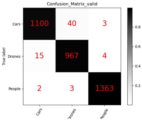 Figure 8 and Figure 9 show the confusion matrices for RangDopplerNet Type-1 and Type-2, respectively [23]. In each matrix, rows correspond to the true class labels, while columns represent the predicted labels. To facilitate understanding, Figure 7 is used as an illustrative example. The second row represents samples with a true label of UAV, totaling 986 instances. Among them, 952 were correctly classified as UAVs, while 30 were misclassified as vehicles and 4 as pedestrians.