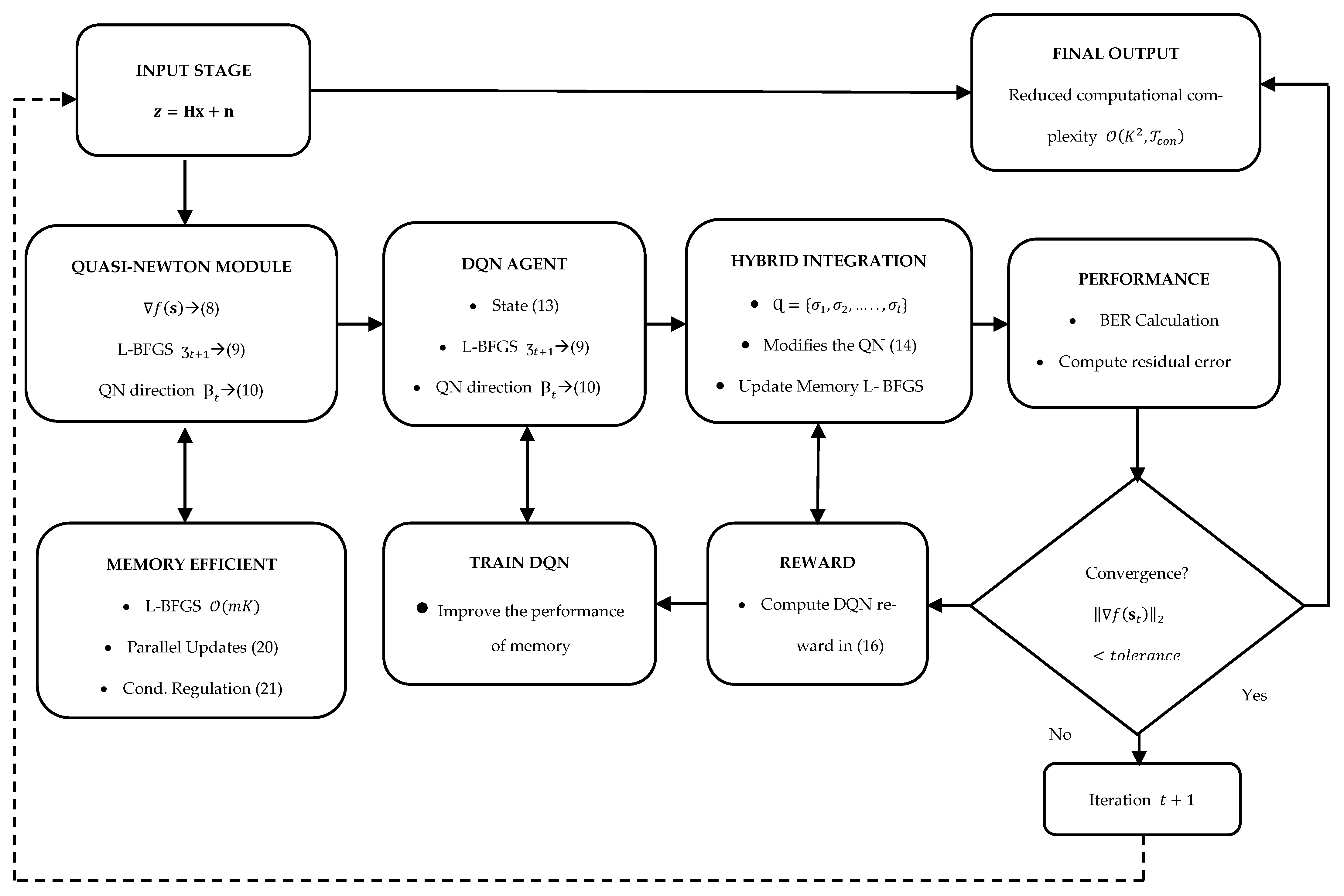 24] proposed resource-aware optimization techniques that evaluate trade-offs across CPUs, graphics processing units, and dedicated accelerators to balance hardware efficiency with detection performance. This research aims to develop a hybrid ISD framework for massive MIMO in 6G systems by integrating DQN with QN methods to overcome the limitations of conventional linear MMSE detectors. The proposed approach reduces computational complexity by avoiding explicit high-dimensional matrix inversions, improves detection robustness by combining the stable search directions of QN with the adaptability of DQN, and enables memory-efficient near-optimal detection suitable for practical 6G base station architectures. This study is structured around three main goals that have not received sufficient attention in high-dimensional matrix inversions for linear MMSE detectors: improving the stability of QN with the flexibility of DQN and developing memory-efficient underperformance ceiling detectors that build on the limitations noted in previous studies.