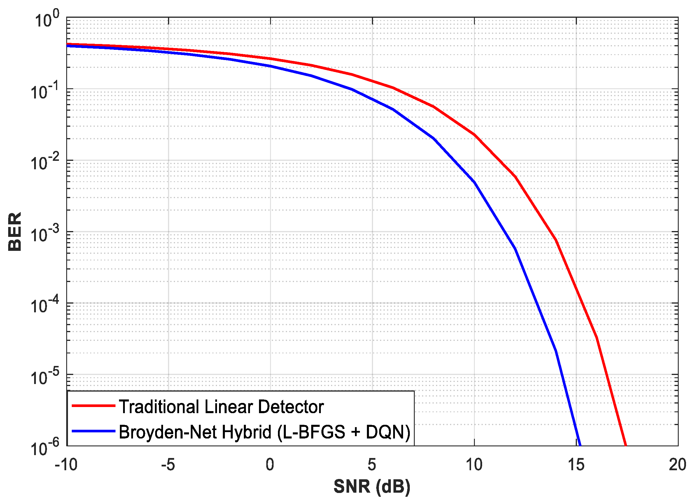 17]. On the other hand, the Broyden-Net hybrid exhibits a more pronounced improvement in the medium-to-high SNR regime (5–15 dB) while maintaining a significantly lower BER. This finding implies that while the learning component adaptively corrects for interference and channel distortions, the QN structure improves convergence stability.