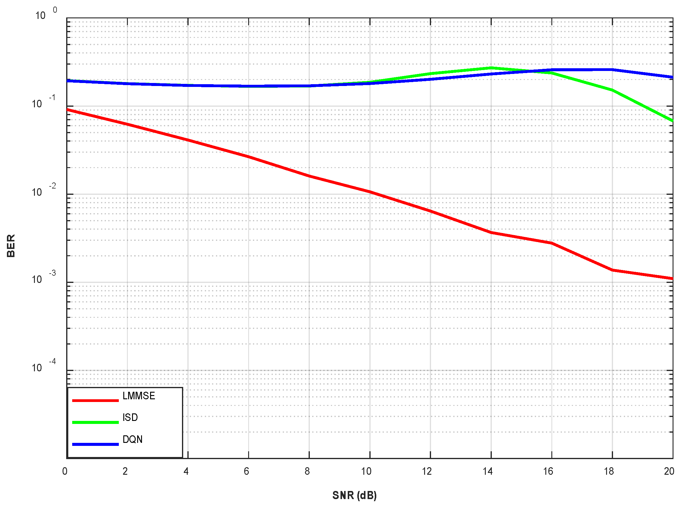 Figure 3 can be attributed to its ability to exploit full channel state information through direct matrix inversion, which ensures near-optimal linear signal recovery in Rayleigh fading channels. This allows the LMMSE detector to achieve significantly lower BER at higher SNR values, as noise and interference can be effectively suppressed. On the other hand, ISD and DQN are designed to reduce this complexity by relying on ISD or DQN rather than exact inversion. While these methods trade some BER performance at high SNR, they offer more accurate and stable results in the low-to-medium SNR regime, where linear detectors often struggle with residual interference. The ISD further refines its estimates with QN updates, giving it better high-SNR adaptability than DQN, which saturates due to the limited generalization of its learned policy. Thus, LMMSE achieves the lowest BER but at the expense of complexity, while ISD and DQN strike a balance between accuracy and computational efficiency.