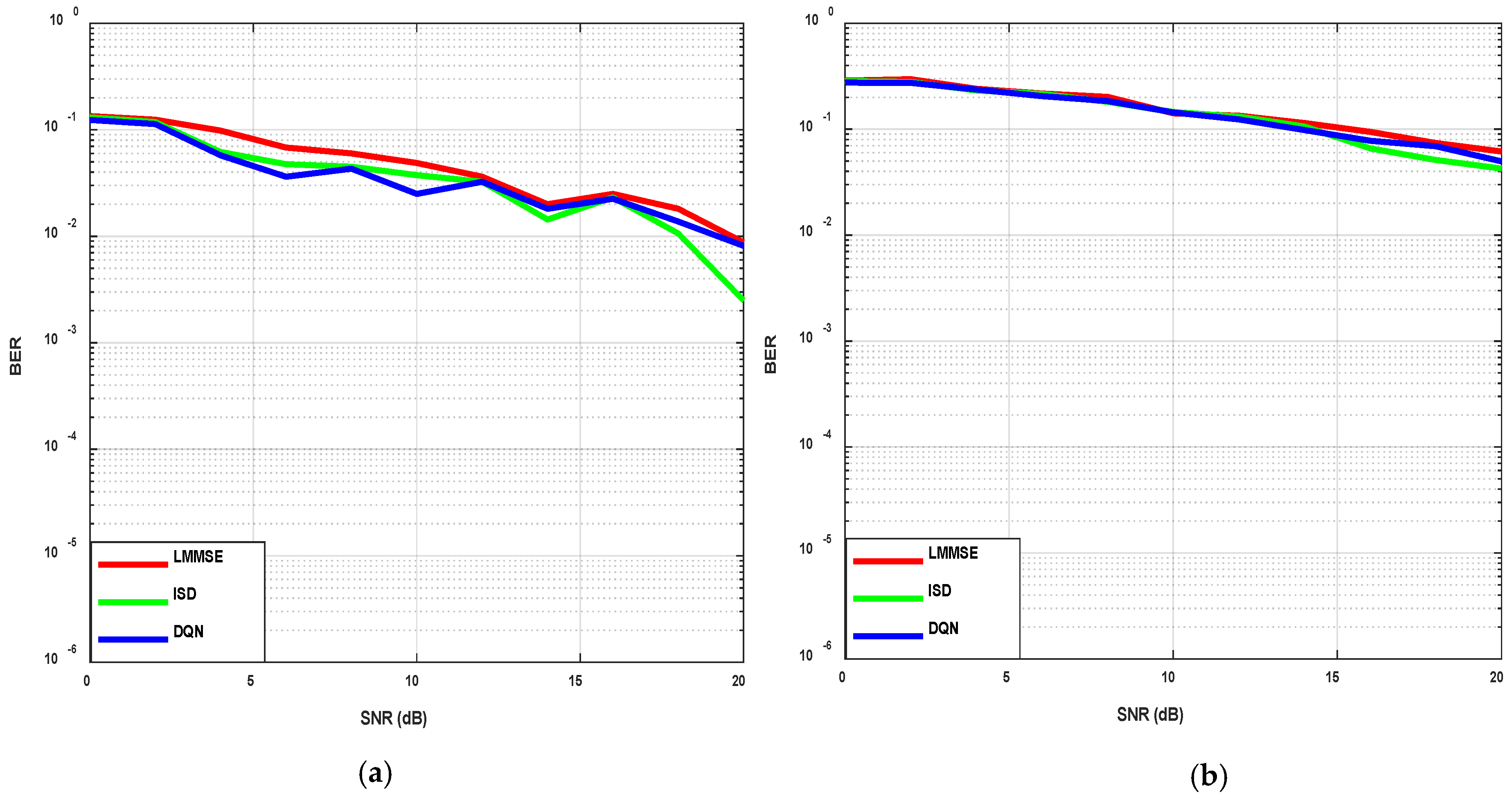 In this section, simulation results are conducted to verify the performance of the proposed LMMSE, ISD, and DQN detection algorithms in m-MIMO scenarios. The experiments implemented used various m-MIMO channels and antenna configurations across an SNR range from 0 to 20 dB, in 2 dB increments. The simulations employed synthetic channel data generated using the Rician fading model specified in (2), with Rayleigh components following spatial correlation matrices defined in (3). The noise model utilized AWGN with a covariance matrix