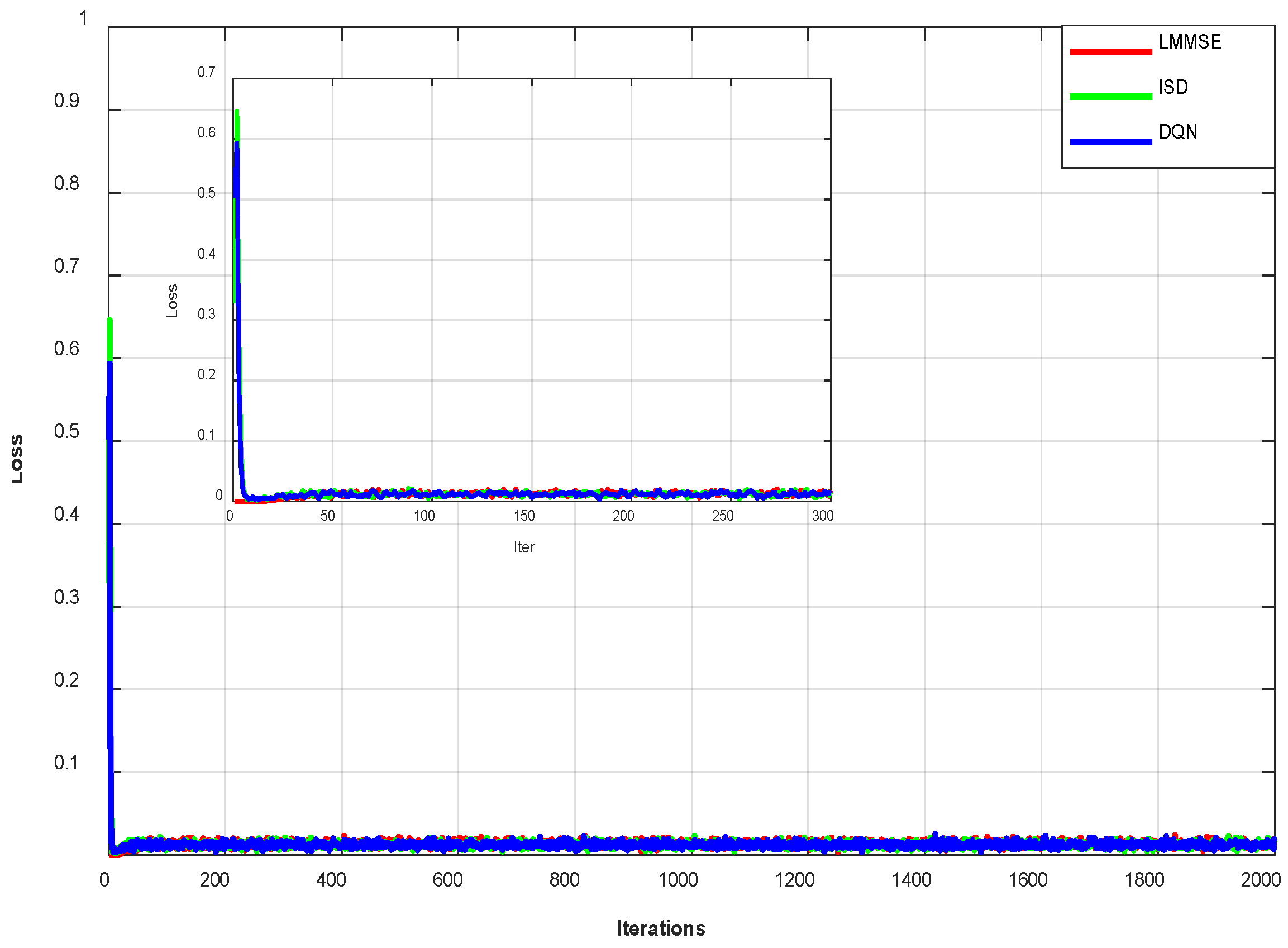 Figure 6 illustrates the loss convergence of the considered approaches, where all algorithms exhibit a sharp decline in loss within the first 50 iterations, with the inset further emphasizing their rapid convergence behavior. Although the LMMSE detector provides stable performance, its reliance on computationally expensive matrix inversion fundamentally limits scalability. In contrast, both ISD and the proposed DQN-based framework achieve consistently lower steady-state losses, with DQN demonstrating enhanced robustness in mitigating residual errors. This improvement can be attributed to the adaptive state representation and the step-size adjustment rule in (13), which enable the DQN agent to regulate convergence behavior under varying channel conditions dynamically. Furthermore, the Broyden-Net approximation of the Q-function, combined with the reward function design in (15), ensures a balance between convergence speed and detection accuracy, effectively reducing real-time training overhead.