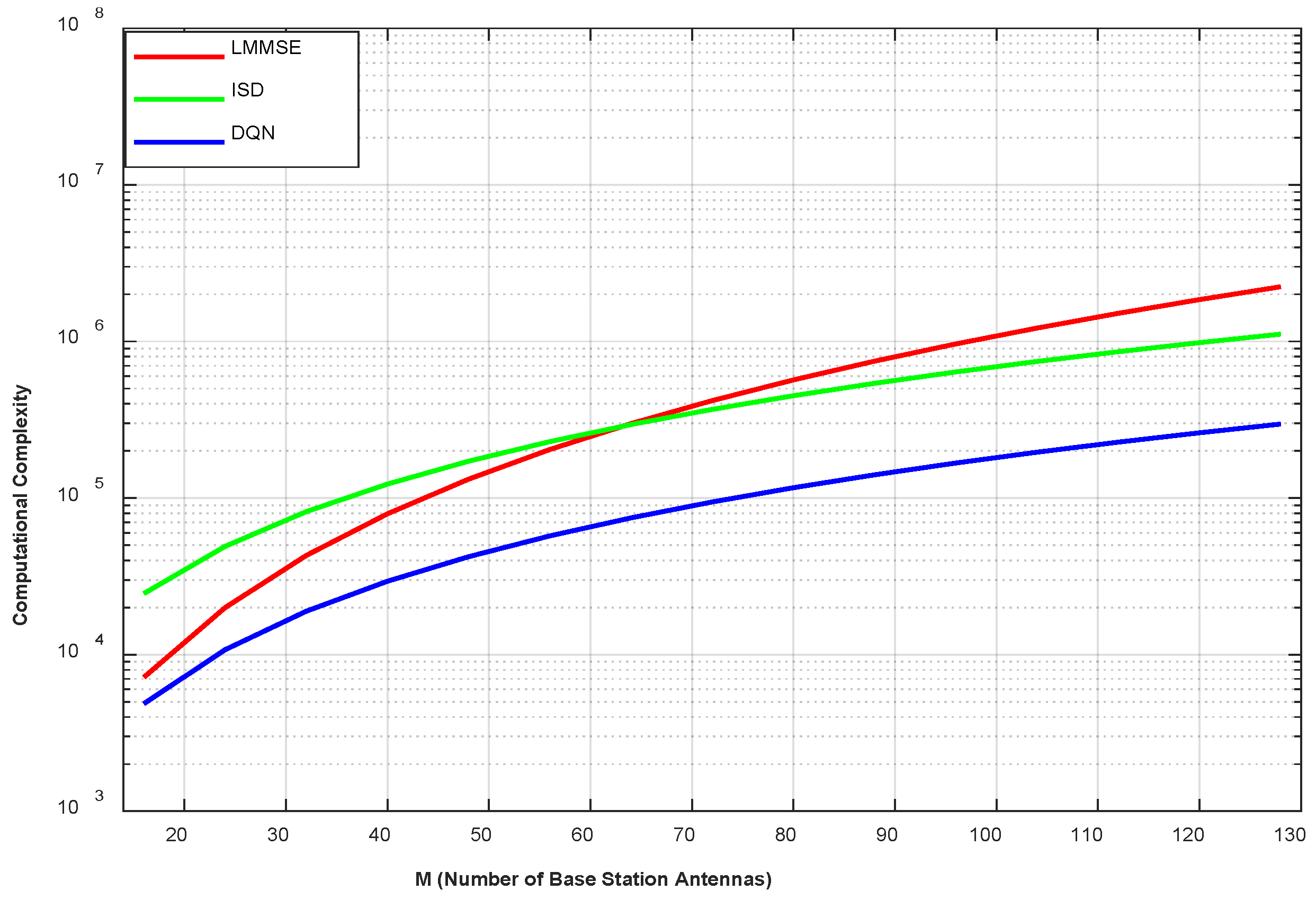 Figure 8 illustrates the computational complexity of three different detection algorithms, LMMSE, ISD, and DQN, as a function of the number of base station antennas