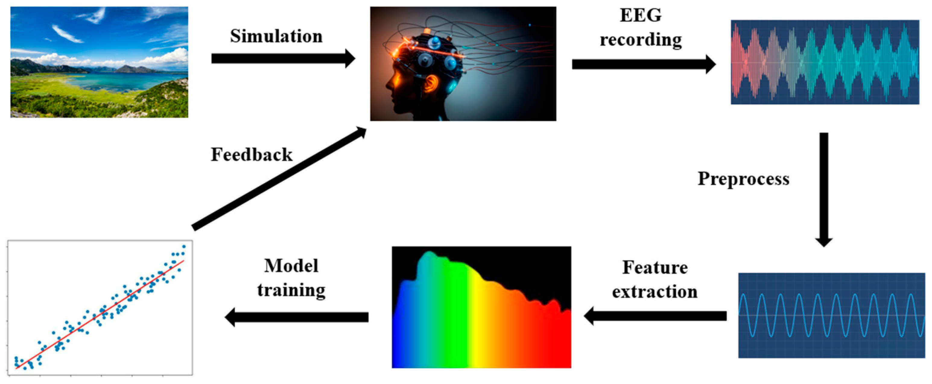 Figure 1, the emotional brain–computer interface (EBCI) framework typically comprises several key stages, including stimulus presentation, electroencephalogram (EEG) signal acquisition, preprocessing, feature extraction, model training, and feedback. This iterative cycle enables the systematic modeling and analysis of EEG signals to infer users’ emotional states, thereby providing a foundation for advanced human–computer interaction.