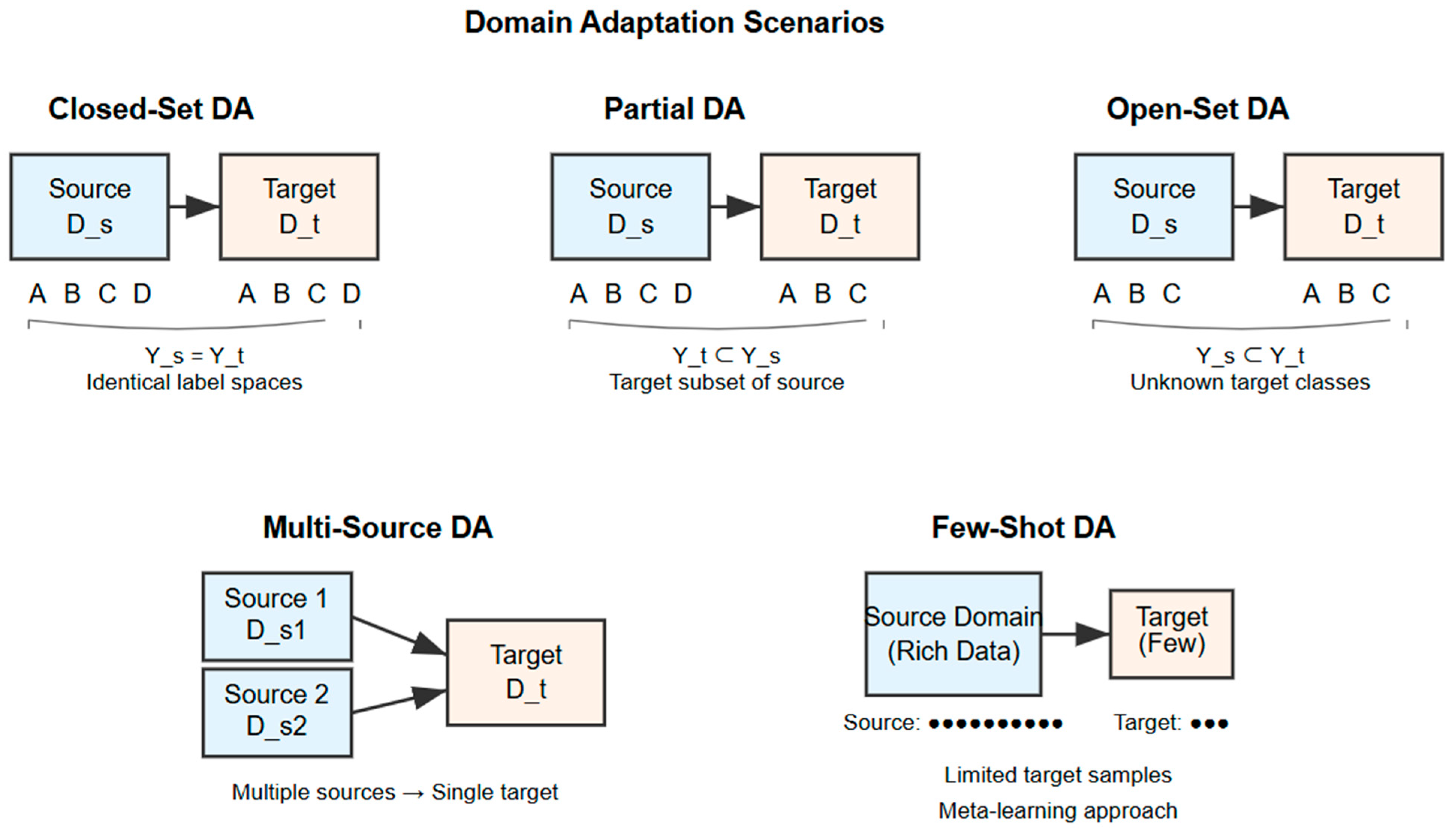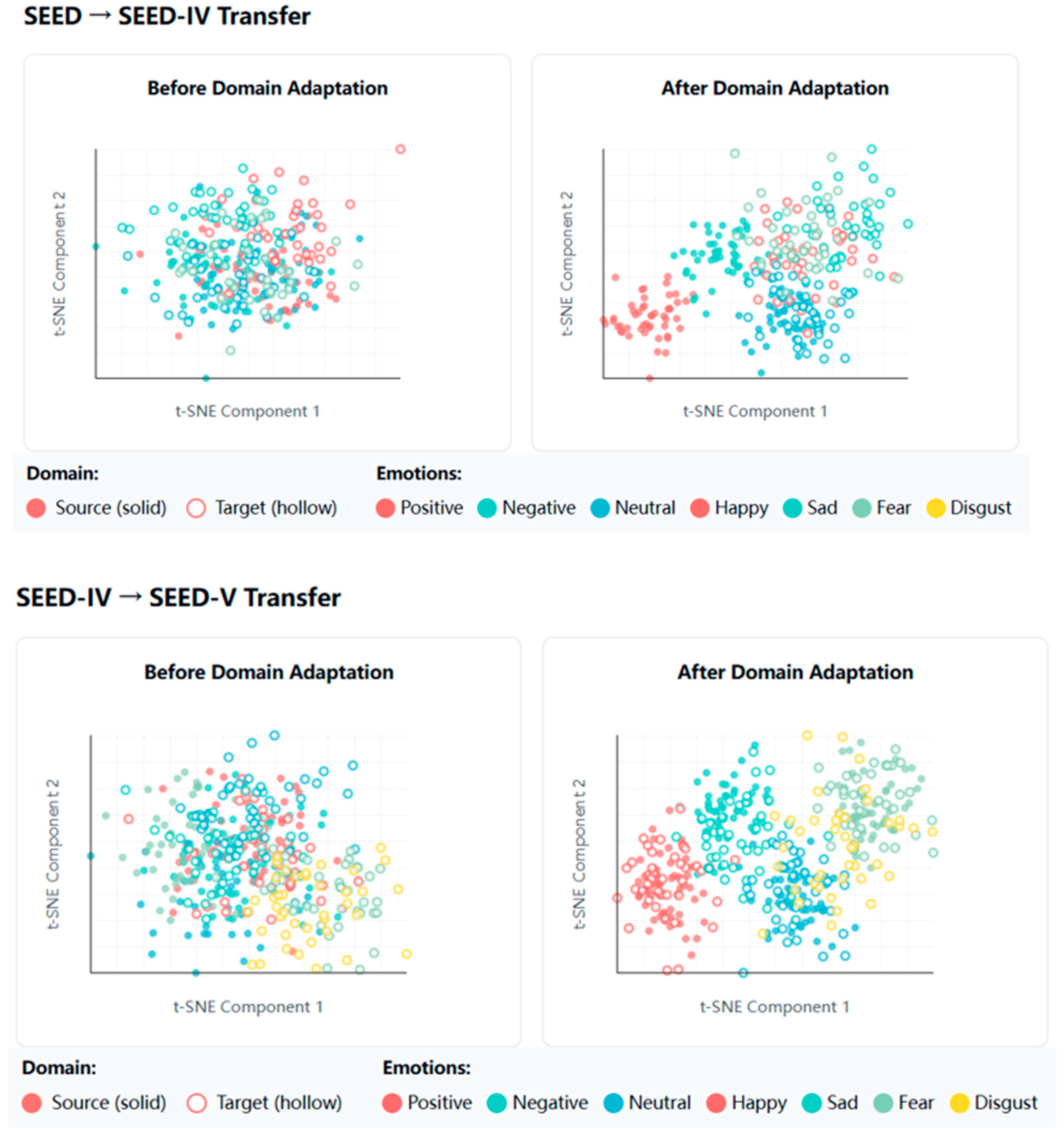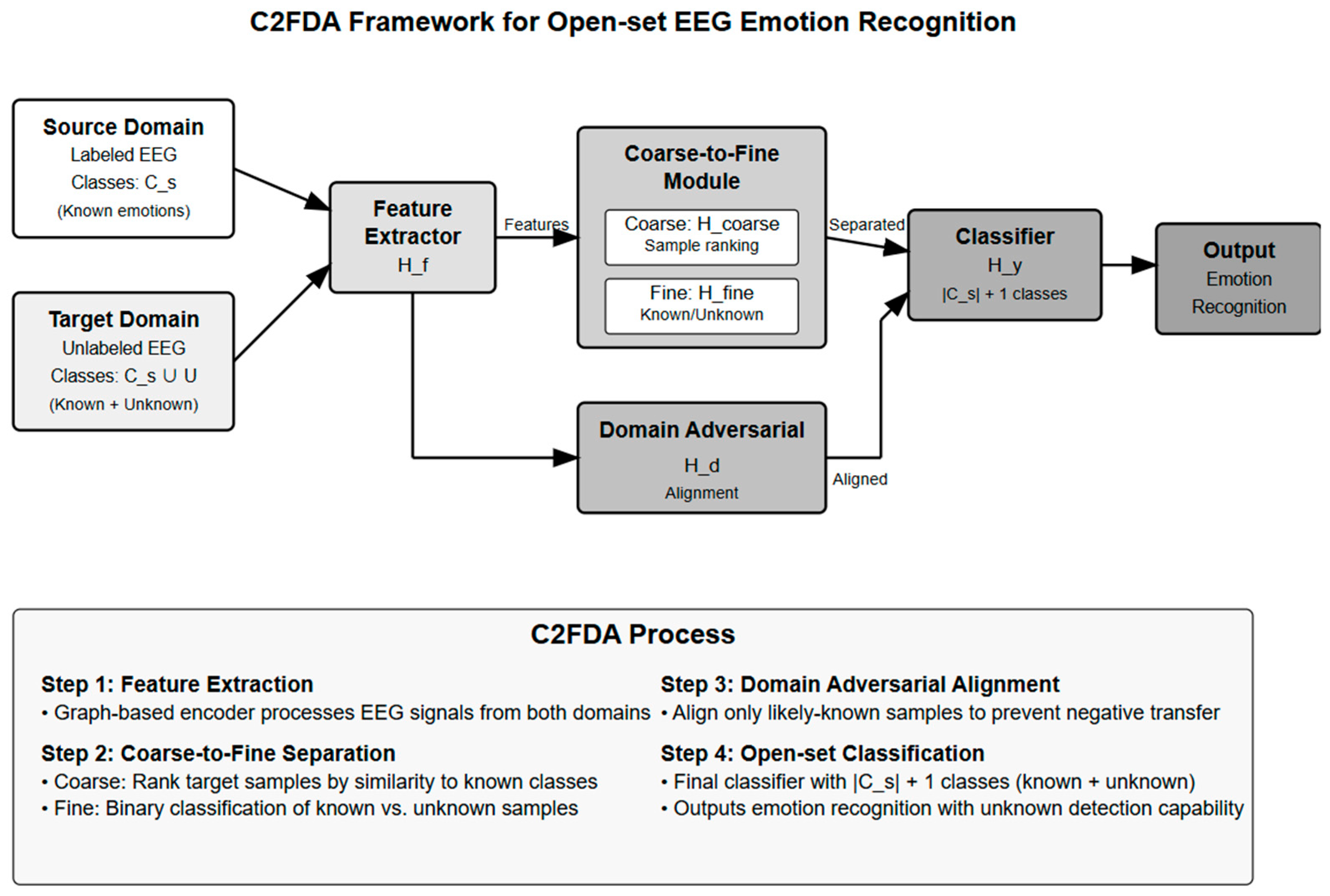 4]. It shows that the emotion recognition model trained with EEG data on a single subject may not achieve satisfactory results on a new subject, that is, there is a problem of model generality. In realistic deployments, the target domain may also contain emotion states absent from the source, creating an open-set scenario. In open-set domain adaptation (OSDA), the model must (i) align only the shared classes between domains and (ii) reject unknowns to avoid negative transfer. This setting is common in cross-dataset and cross-subject EEG but remains underexplored relative to closed-set transfer.