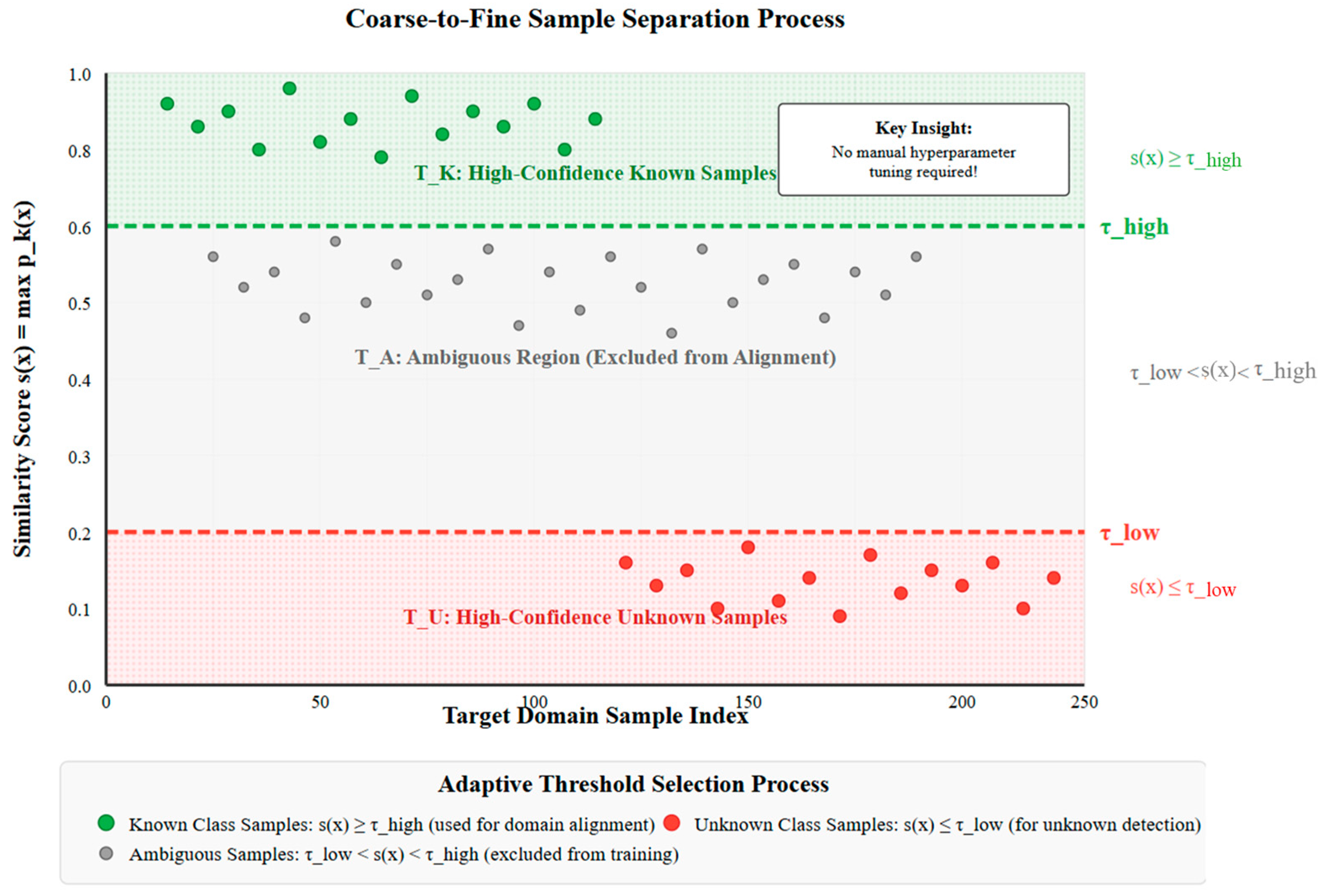 Figure 3 Coarse-to-fine sample separation via adaptive threshold selection. Target domain samples are stratified into three regions based on similarity scores: high-confidence known sample region (green) for domain alignment; ambiguous sample region (gray) excluded from training; and high-confidence unknown sample region (red) for novel class detection. The high and low adaptive thresholds are automatically determined without hyperparameter tuning. This approach is conceptually similar to the Separate to Adapt (STA) method, which employs a coarse-to-fine separation mechanism to progressively distinguish between known and unknown classes based on sample similarity. In STA, sample importance is adaptively weighted during feature distribution alignment, and unknown target samples are excluded from the alignment process to prevent negative transfer. While STA addresses domain adaptation across varying levels of openness, this work utilizes adaptive threshold selection to specifically tackle the challenges of open-set EEG emotion recognition without the need for manual hyperparameter tuning.