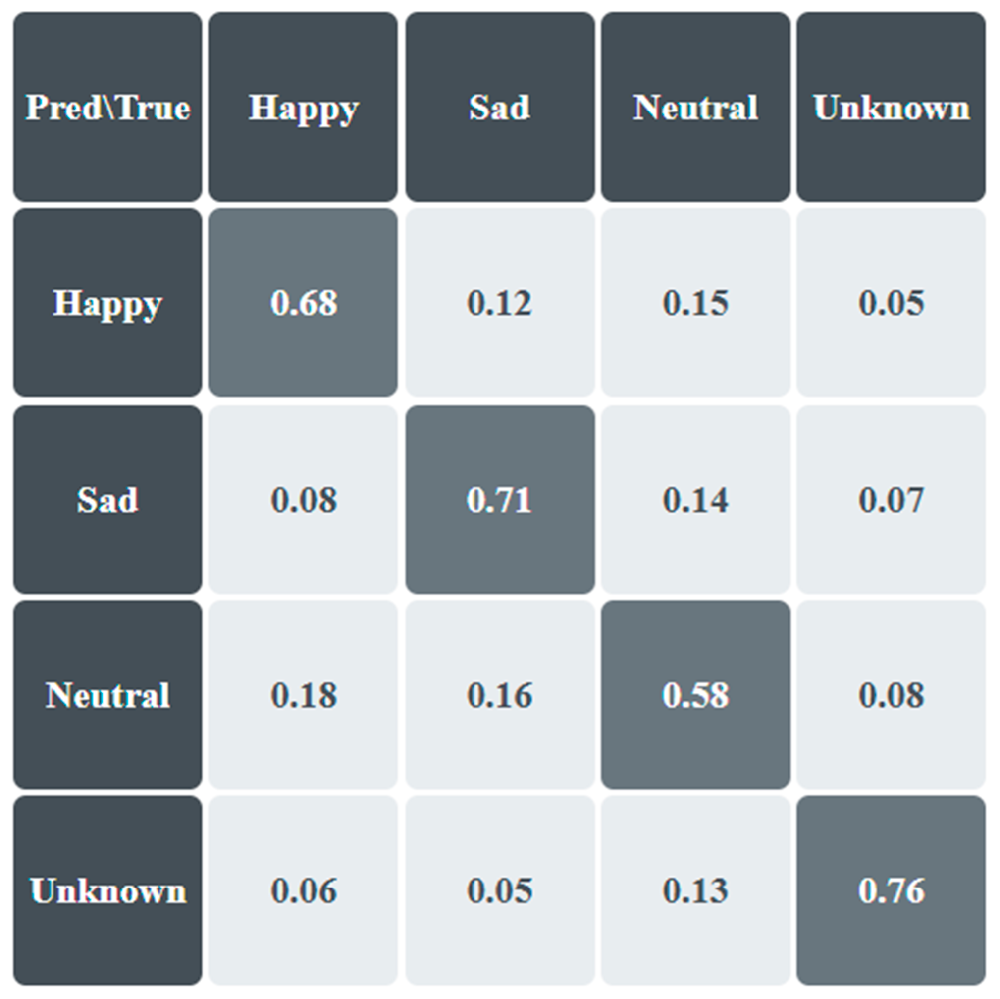 In summary, the biggest problem of an open-set task is the separation of known emotions and unknown emotions. In order to solve this problem, we propose the C2FDA method. The C2FDA method uses a gradual method to find two types of samples with high scores and low scores during training. Because the prediction results of the samples with high scores will be more accurate, it is also conducive to training the classifiers of known classes, while the samples with low scores tend to be the samples of unknown classes, so we can extract these samples to train the classifiers of unknown classes. By this means, we can well separate the known emotion from the unknown emotion. At the same time, it also solves the impact of the negative migration of wrong samples.