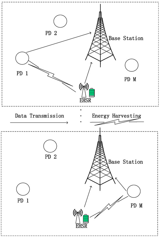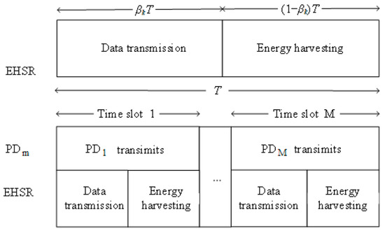 This study investigated an uplink communication scenario in an energy-constrained CR-NOMA IoT network. As illustrated in Figure 1, the network comprises a base station (BS), M primary devices (PDs) and an EHSR. PDs are ensured to transmit data in distinct time slots following a time-division multiple access (TDMA) scheduling protocol. Specifically, the PD is assigned the time slot to guarantee its data transmission priority. As depicted in Figure 2, the EHSR, denoted as , achieves non-orthogonal multiplexing by sharing one of the PDs’ time slots to send information to the BS and simultaneously harvesting energy during this process based on the underlay mode [40]. The BS utilizes SIC technology, aided by known CSI that includes both large-scale and multipath fading. The BS first decodes the PD’s signal and subtracts it from the received mixed signal to decode the signal for . During any given time, slot , commences data transmission, where . represents the channel gain between the BS and . signifies the channel gain between and . represents the channel gain between and BS. These channel gains encompass both effects, and the channel-state information is assumed to be known. uses seconds for data transmission, where is the time allocation factor, is the duration for every time slot. The remaining seconds are utilized for energy harvesting. We summarize the main notations of this paper in Table 1.