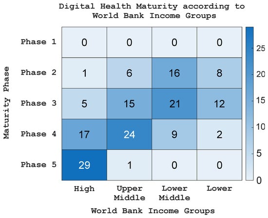 Heatmap of WHO’s Digital Health Maturity Phase according to the World Bank Income Groups in 2023.