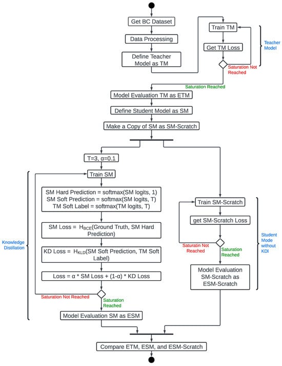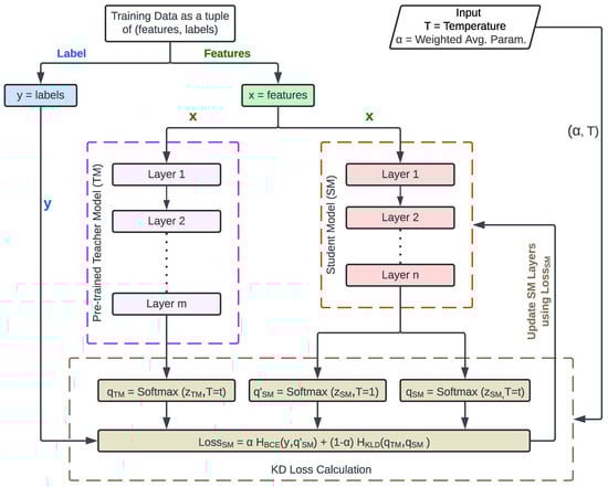 Pytorch and Keras have KD libraries [45,46]. This paper uses the Keras implementation [46]. The technique minimizes a loss function that incorporates both the teacher’s softened logits and the ground-truth labels during training. Figure 2 is the flowchart for teaching the SM using KD. Intel® Labs inspired it [44]. The process starts with inputting the dataset features (X) into a pre-trained TM and the SM. The TM and the SM produce the and the logits, respectively. KD also collects the softmax Temperature (T) and weighted average parameter () from the developer. It uses the softmax function (see Equation (1) proposed by Hinton et al. [47] to create TM soft labels, SM soft predictions, and SM hard predictions as , , and , respectively.