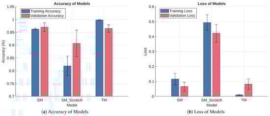 Our proposed model uses Keras’s Kullback–Leibler (KL) divergence loss function () to minimize the squared difference between the soft logits of the TM and SM (i.e., and , respectively). It also uses the Binary Cross Entropy loss function () to calculate the Loss between the SM’s hard prediction () and the ground-truth (y). In the last step, the system uses a weighted average on and losses with as the weighing parameter to calculate the SM’s Loss (). Hinton et al. [47] typically used a small in their weighted average. Smaller values enable the student model to place greater emphasis on the teacher’s softened predictions, thereby improving generalization.