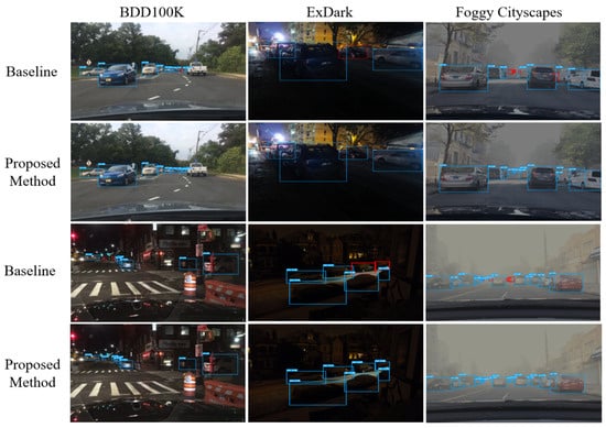 Qualitative comparison of detection results on the BDD100K, ExDark, and Foggy Cityscapes datasets.
