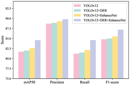 Visual Analysis on ExDark.Figure 6 shows a consistent upward trend in all metrics across module combinations. DER mainly stabilizes predictions by adjusting feature exposure levels, while EnhanceNet improves texture visibility in dark regions. The complete model achieves notable Recall and F1-score gains (+2.4% and +2.1%), highlighting improved recovery of low-illumination details and more reliable detection under severe darkness.