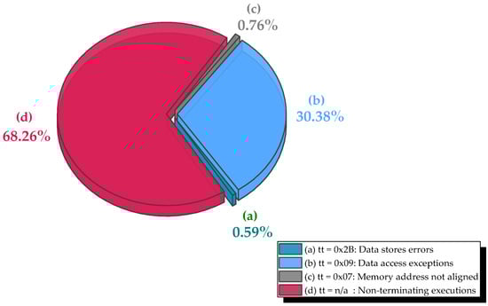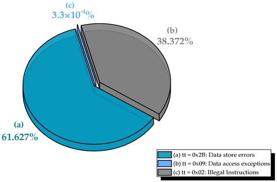 As shown in Figure 4, the dominant fault manifestation is the data store error (trap type tt = 0x2B), accounting for 89.7% of all observed exceptions. In LEON3, this trap is raised when the AHB returns an error response during a store operation, typically due to corrupted address or data values being written to an invalid or protected memory region. Because the data cache employs a write-through policy, every store accesses SDRAM directly. Thus, MBUs affecting store operands or addresses are immediately exposed. A marked increase in data store errors emerged from Series 3 onward, confirming that memory corruption predominantly surfaces during write operations.