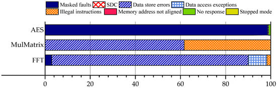 To assess the vulnerability of compute-intensive workloads to memory corruption, a fault injection campaign was conducted on the matrix multiplication (MulMatrix) benchmark running on the LEON3 processor. A total of 303,000 dual-bit MBUs were injected into SDRAM across two independent execution series, with system responses classified by exception type and functional impact, as detailed in Table 2 and Figure 5.