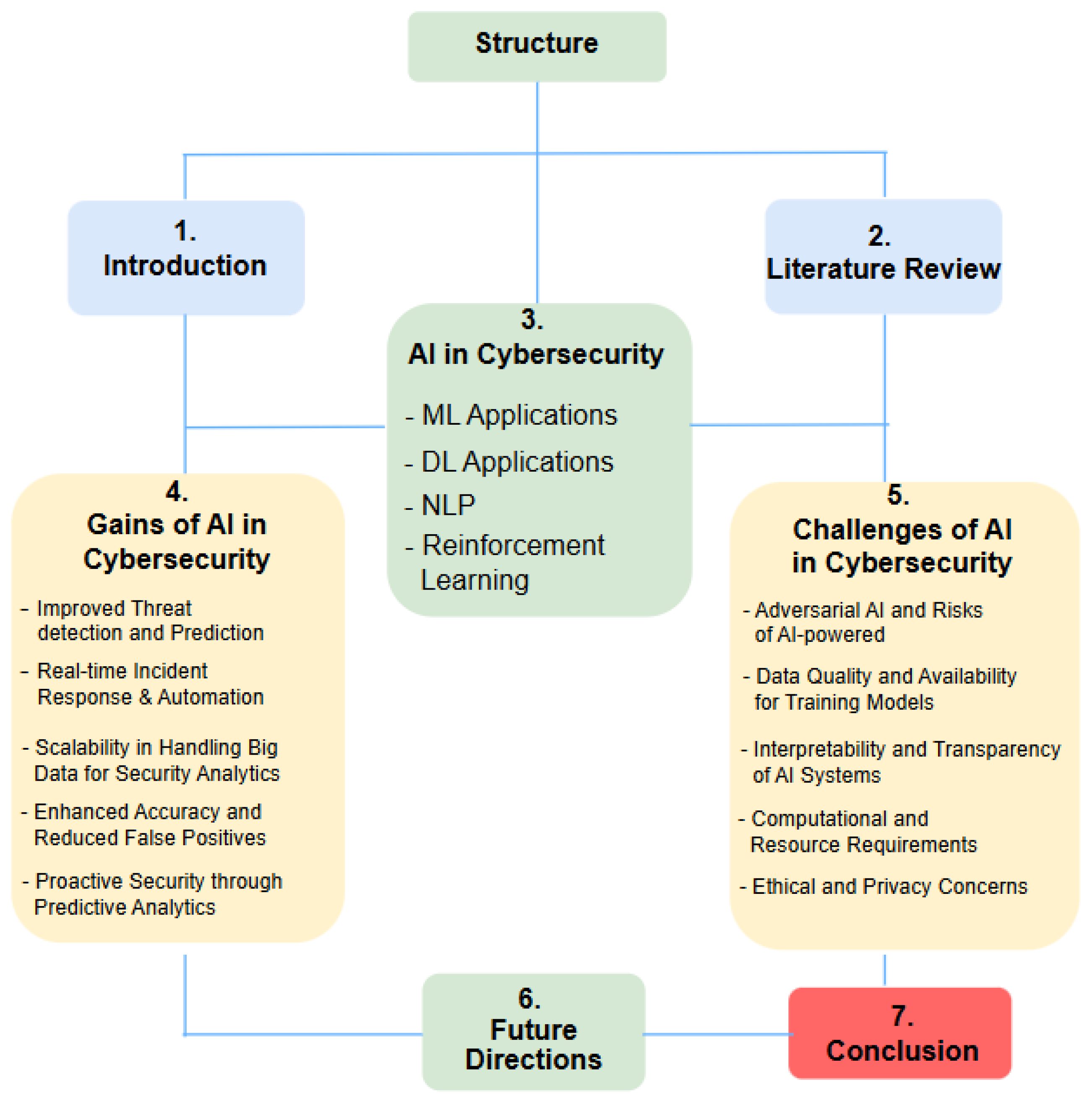 - We present a unified and technically strong synthesis of the major AI paradigms, ML, DL, NLP, and RL, highlighting how each contributes to contemporary cybersecurity defense mechanisms.