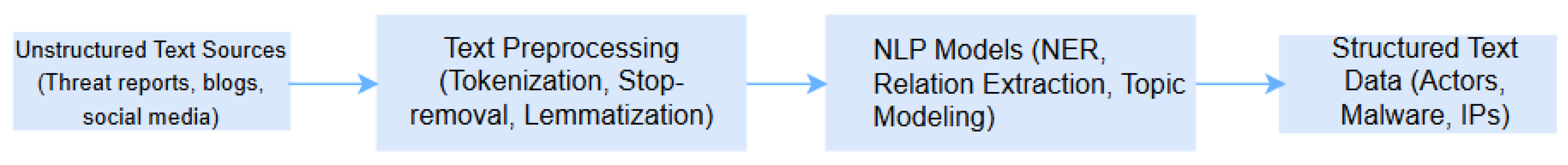 | Natural Language Processing | Threat Intelligence Extraction | NER, Dependency Parsing, Relation Extraction | Threat feeds, reports, blogs, dark web discussions | Extracted entities (IPs, malware, CVEs, actors) | Automates CTI generation; improves response time | [36,38,39] |