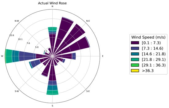 Figure 5 presents a visual comparison of the model forecasts using the wind rose diagrams generated for the test set period (4 July 2022–12 April 2023). The observed distribution revealed dominant W and E–NE wind components with secondary flows from the S–SW sector, consistent with the prevailing local climatology.