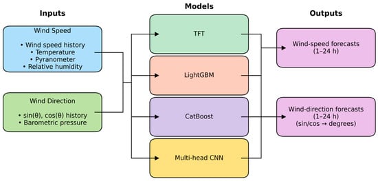 Figure 2 provides an overview of the proposed forecasting framework, illustrating the two input feature groups, the four machine learning models considered in this study, and the resulting multi-horizon predictions for wind speed and wind direction.