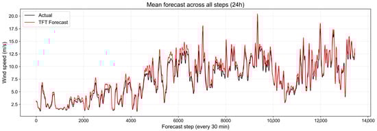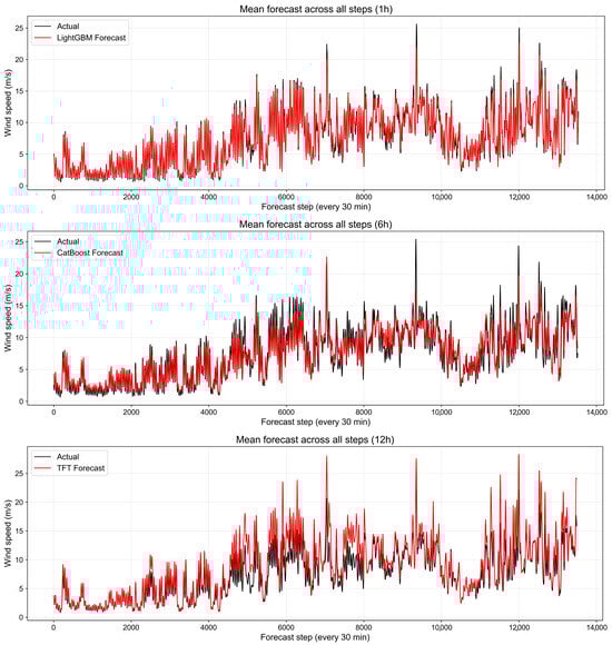 The comparison of forecasting accuracy across horizons, as shown in Table 4, indicates that LightGBM achieved the best performance at the 1 h horizon, confirming its capability to capture short-term local dependencies effectively. At the 6 h horizon, CatBoost slightly outperformed the other models, providing the most accurate wind speed predictions. For longer horizons (12 h and 24 h), the Temporal Fusion Transformer (TFT) exhibited the highest stability and accuracy, maintaining reliable performance as the forecast range increased. The multi-head CNN performed competitively at shorter horizons, but its accuracy degraded more rapidly than those of the other models at longer forecast intervals.