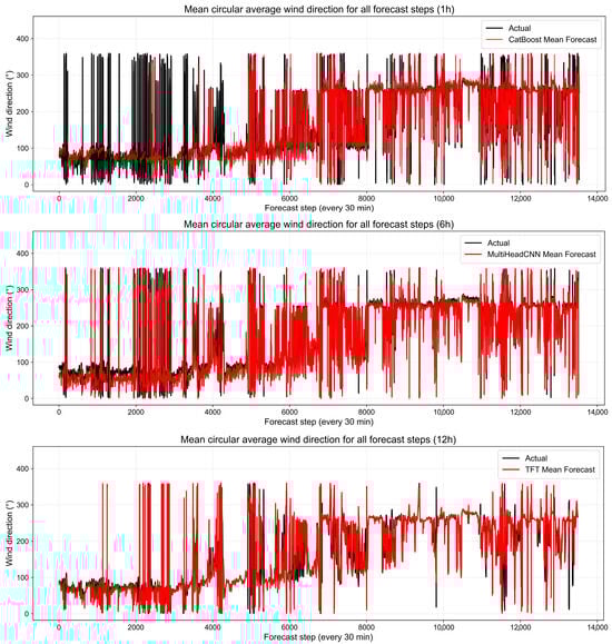 The comparative results for wind direction forecasting in Table 5 show that CatBoost achieved the best performance at the 1 h horizon, effectively capturing short-term directional variability. At the 6 h horizon, the multi-head CNN provided the most accurate predictions, outperforming both the gradient boosting models and the transformer-based approach. For longer horizons (12 h and 24 h), the Temporal Fusion Transformer (TFT) clearly dominated, delivering more stable and accurate angular forecasts than the other models.