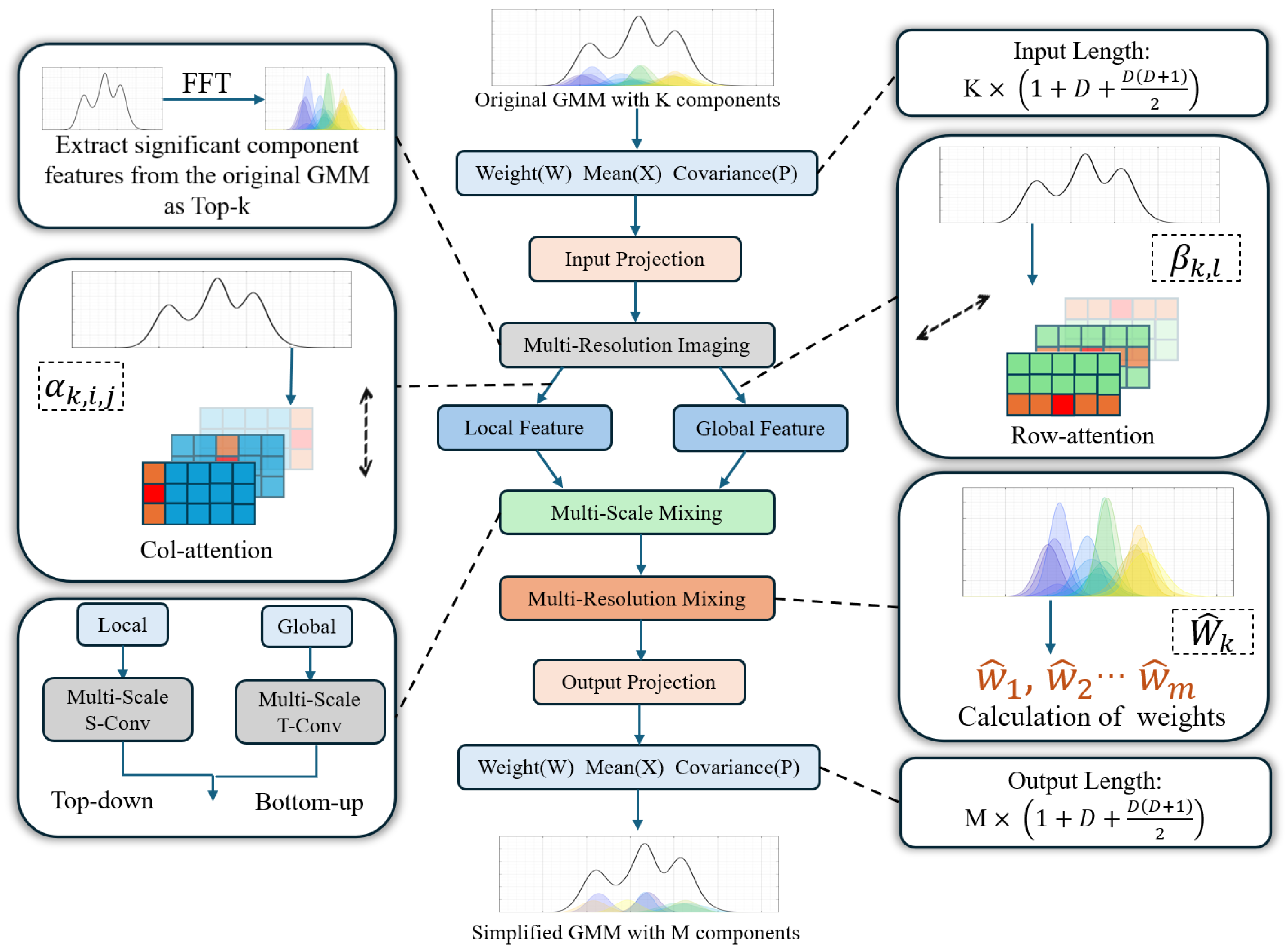 - Global Compression: The parameters (weights , means , and covariances ) of the high-component GMM to be compressed are fed as inputs to the GMMultiMixer model. After the multi-scale feature extraction and fusion process as described earlier, the model directly outputs all parameters of the compressed low-component GMM , where . This step replaces the computationally intensive iterative merging or truncation strategies in traditional methods.