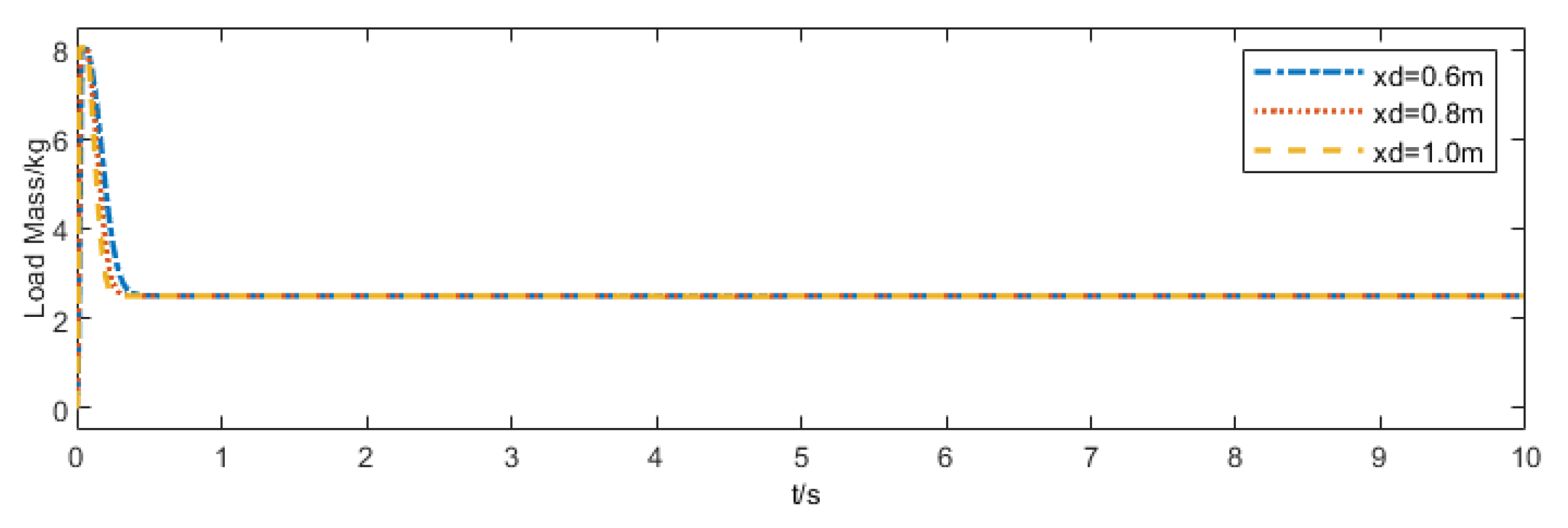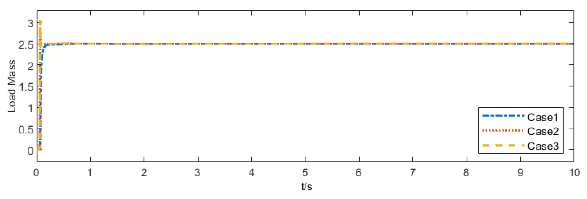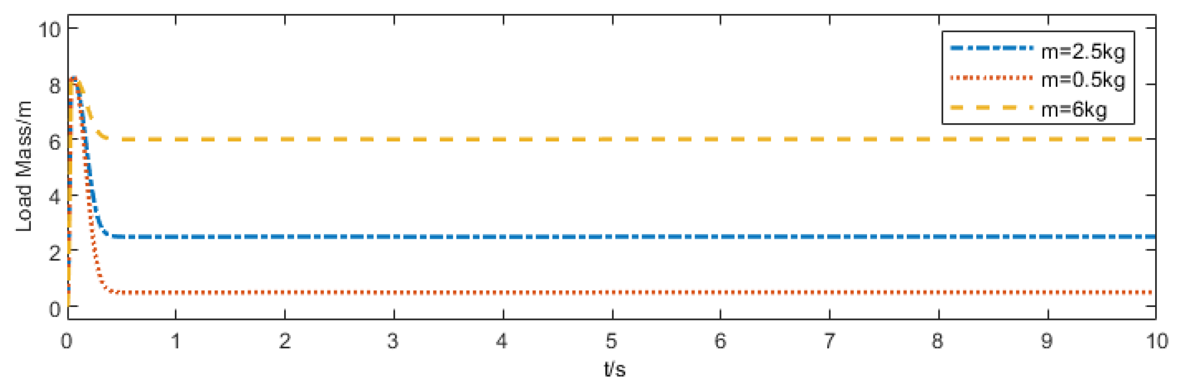 - The mass-adaptive control law designed in this paper can accurately estimate unknown load masses and adapt to varying loads, significantly enhancing the system’s robustness and adaptability under conditions of unknown load mass;