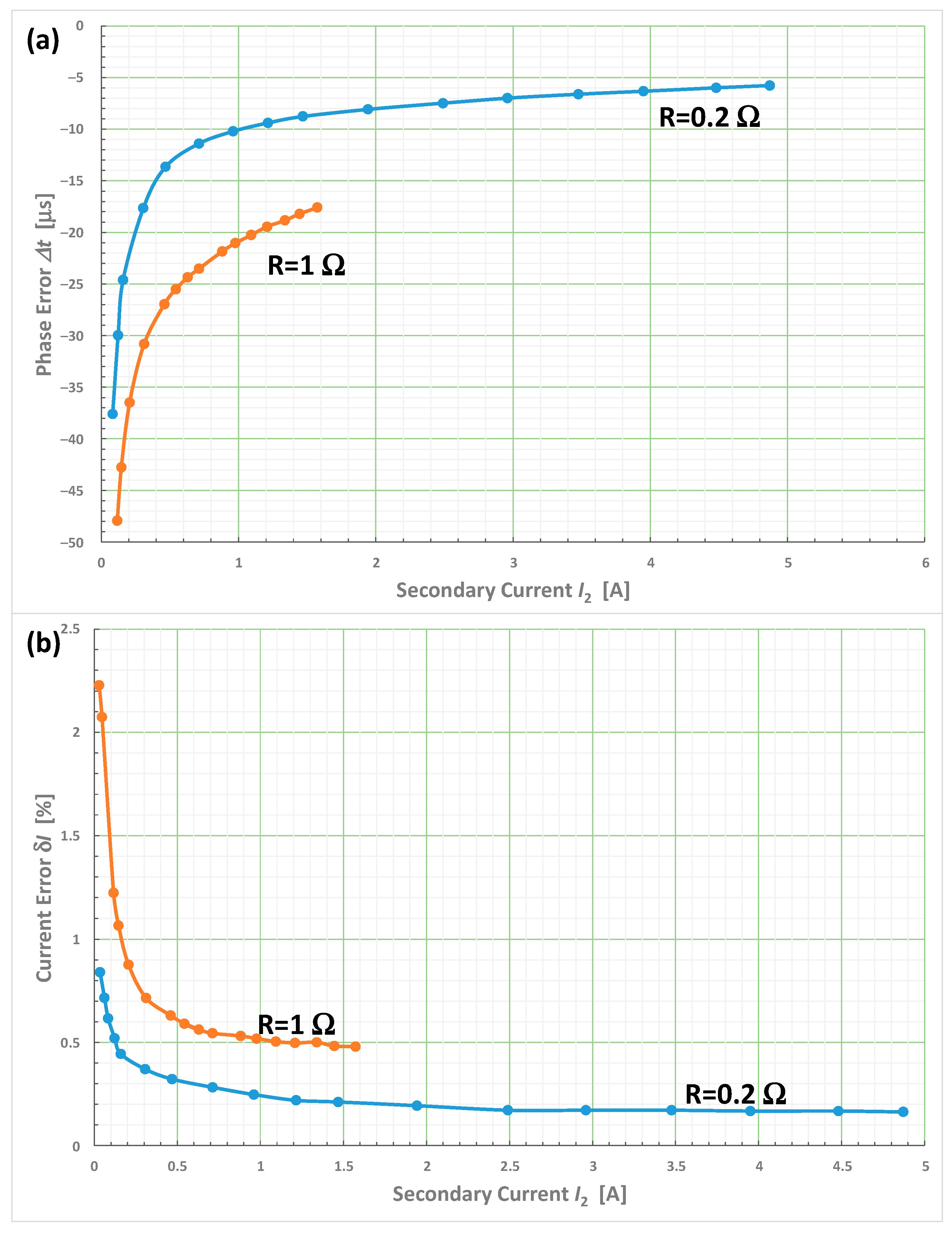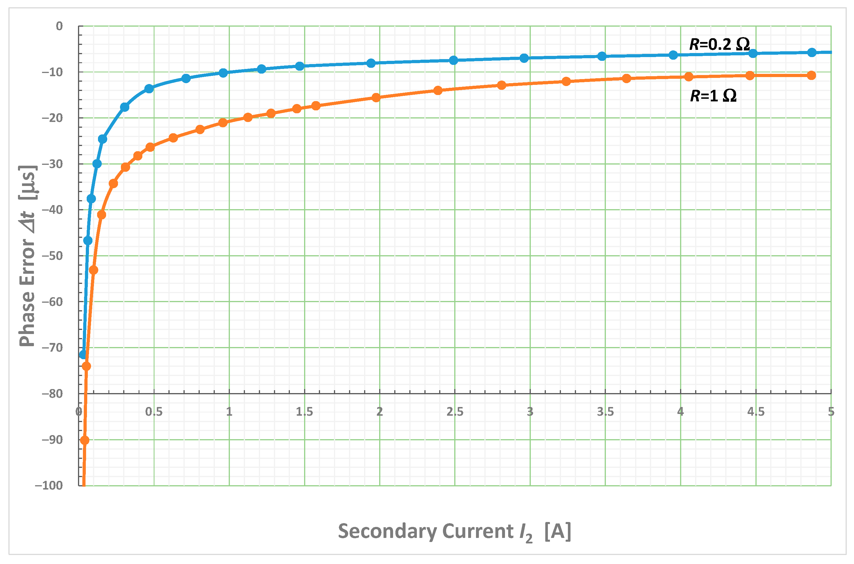 It follows from Formula (15) that a large number of secondary turns ought to be used in order to reduce the error. But then the length of the core and the cross section also need to be reduced. In addition, resistance R2 may increase. The changes will contribute to greater error Δt. The absolute value of error Δt always increases with the resistance of the secondary circuit. The phase error was calculated from Formula (15) on the basis of the following: the characteristic presented in