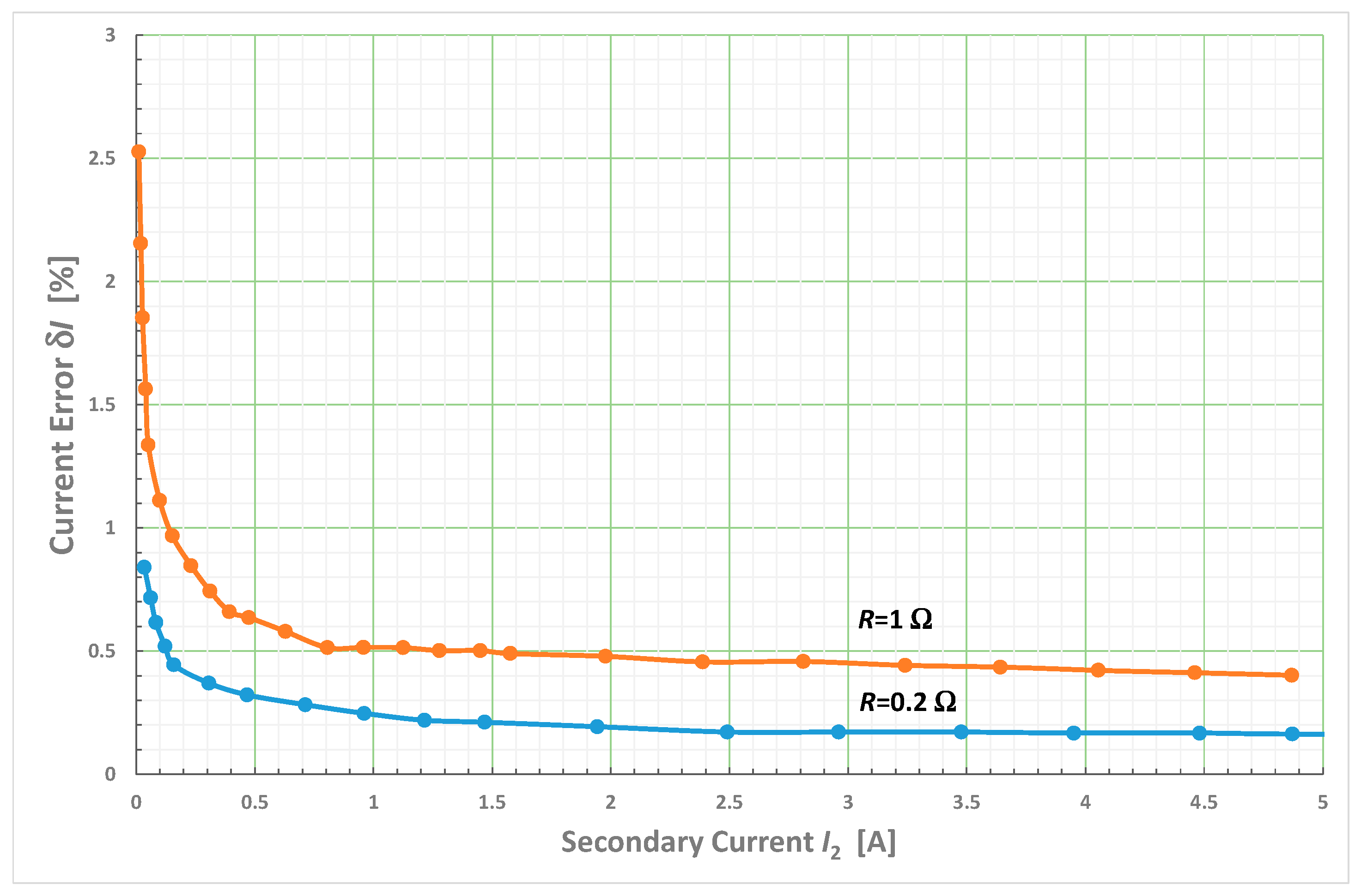 The peak value of the secondary current can be determined on the basis of the peak value of the induced voltage when the secondary circuit is resistive (19). The formula for the relative current error for a given core material characteristic and assigned or assumed current transformer parameters is obtained by substituting relations (14) and (18) into Formula (17).