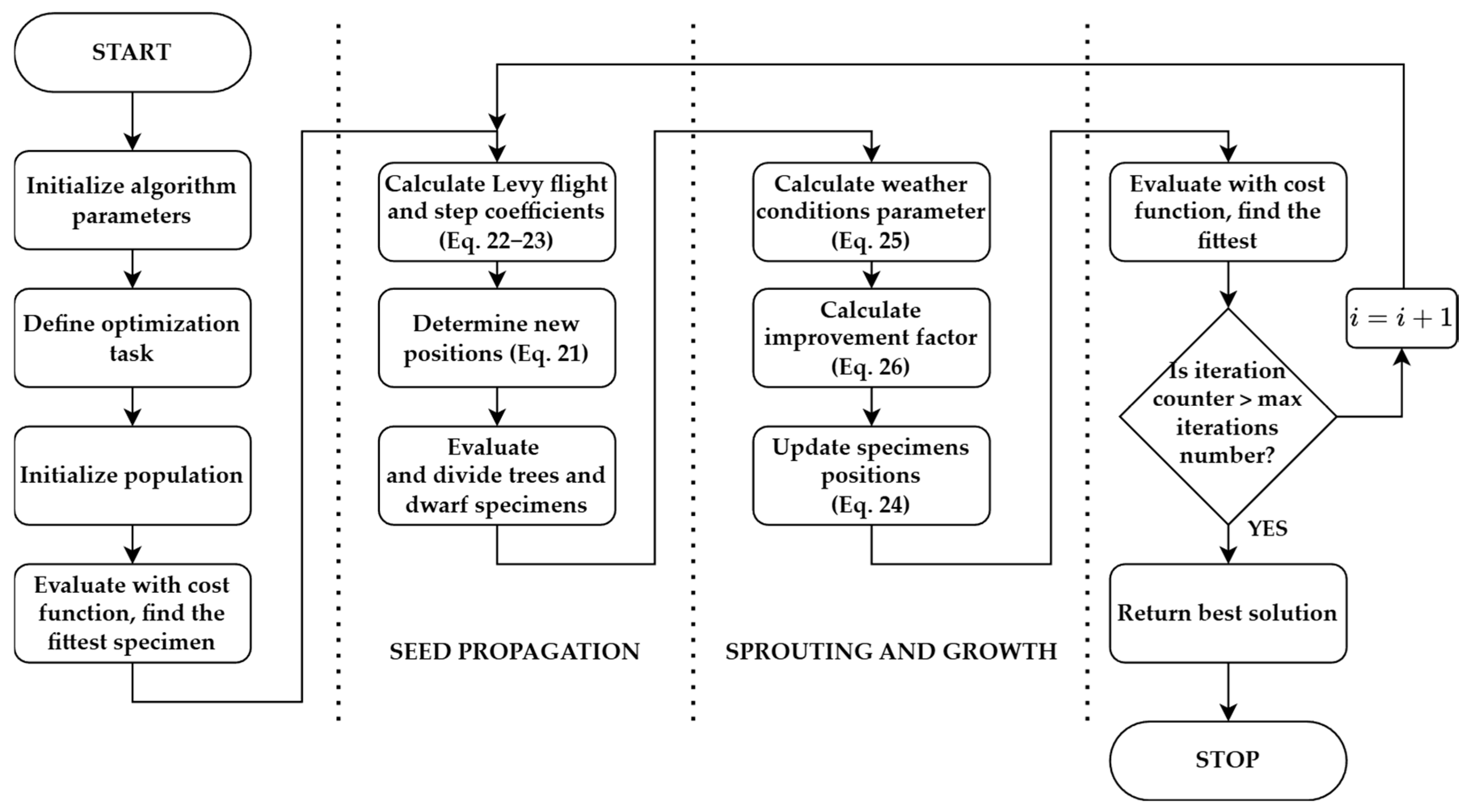 28]. While Grey Wolf Optimizer (GWO) is an algorithm inspired by swarm intelligence of hunting wolves and Flower Pollination Algorithm (FPA) is considered as an evolutionary algorithm, the BiOA is in fact a hybrid solution which incorporates both optimization mechanisms. The FPA was first presented in 2012 by Xin-She Yang and the GWO only two years later by Seyedali Mirjalili, it has been enough time to establish their popularity and confirm optimization efficiency. The natural inspiration of the BiOA comes from pioneer and succession abilities of birch trees, a native species of European forests and groves. Similarly to other nature-inspired optimization algorithms (NIOAs), it is an iterative process of adapting solutions among developing populations. Each iteration of the BiOA is two-step optimization—the first stage represents seed propagation and is described with Levy flight-based [