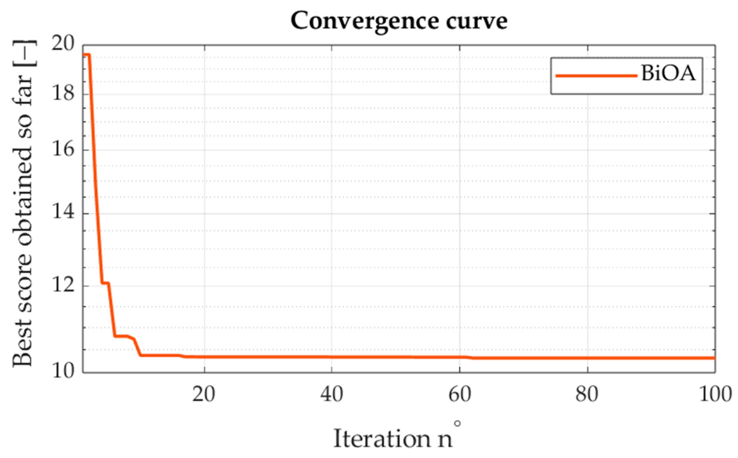 28]. It can be characterized by high accuracy of finding global minimum and resilience to local extrema. Its high efficiency and repeatability do not result from reduced optimization speed, as the convergence speed is comparable to well-known algorithms such as GWO or FPA [