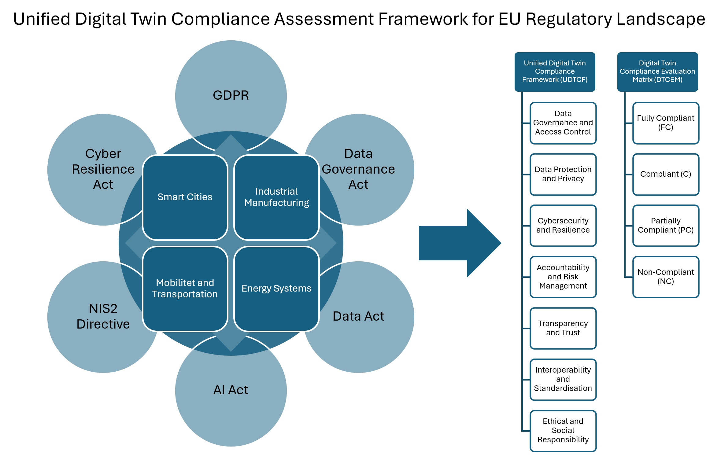 To address this complexity, the study developed the Unified Digital Twin Compliance Framework (UDTCF) and the Digital Twin Compliance Evaluation Matrix (DTCEM). Together, they translate legal obligations into seven meta-categories—data governance and access control, data protection and privacy, cybersecurity and resilience, accountability and risk management, transparency and trust, interoperability and standardisation, and ethical and social responsibility. Applied across 12 representative European cases in Smart Cities, Industrial Manufacturing, Mobility, and Energy Systems, these frameworks provided a structured basis for evaluating compliance maturity and identifying both convergences and gaps.