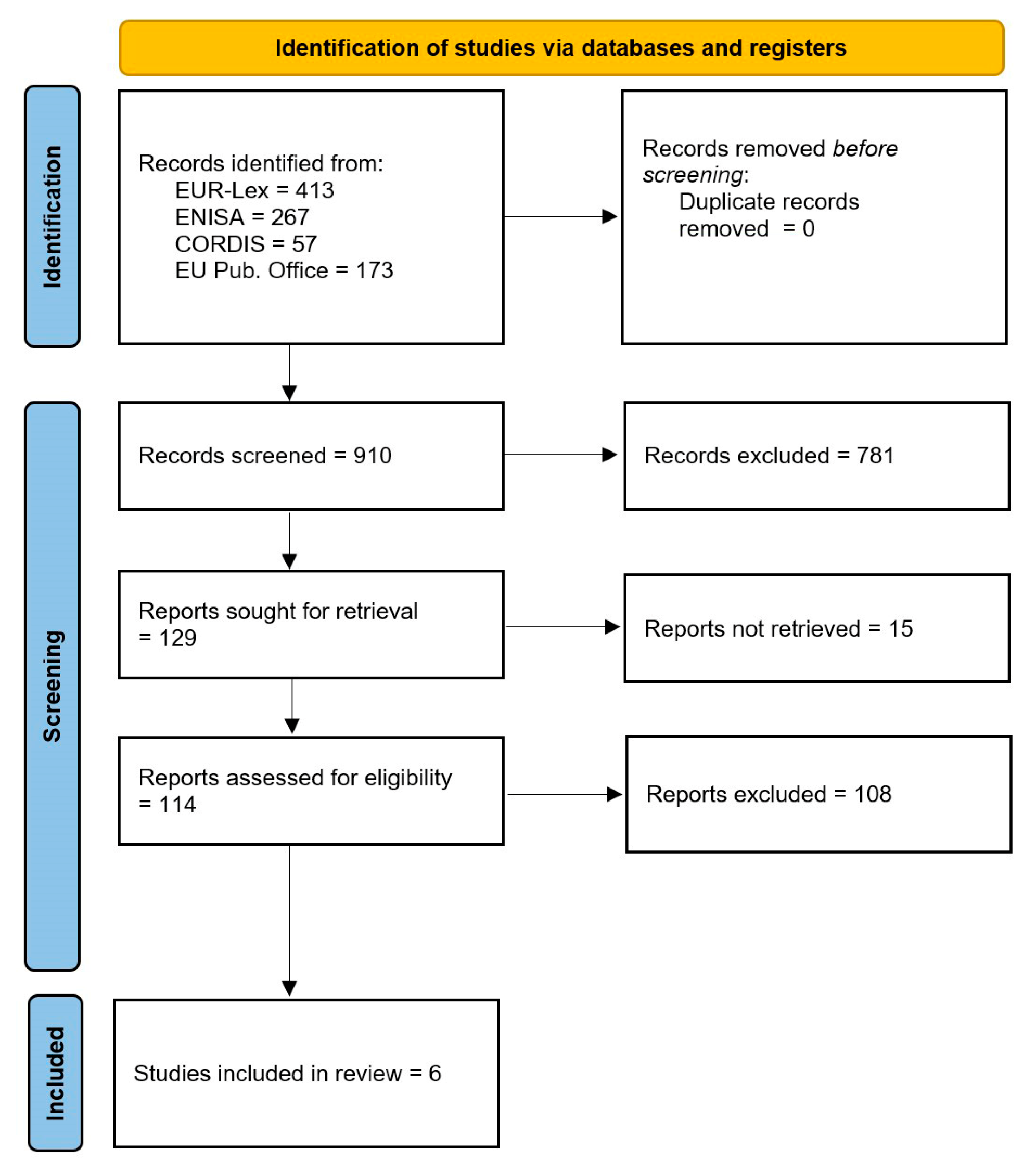Figure 1, which presents the PRISMA-ScR flow diagram adapted for legal-document reviews. The diagram details the number of records identified, screened, excluded, and retained for qualitative synthesis, thereby ensuring transparency and reproducibility of the review process. The following counts reflect document flow through each stage: 910 records identified; 910 screened after duplicates removed; 129 reports sought for retrieval; 114 assessed for eligibility; 6 primary legal instruments analysed and included.