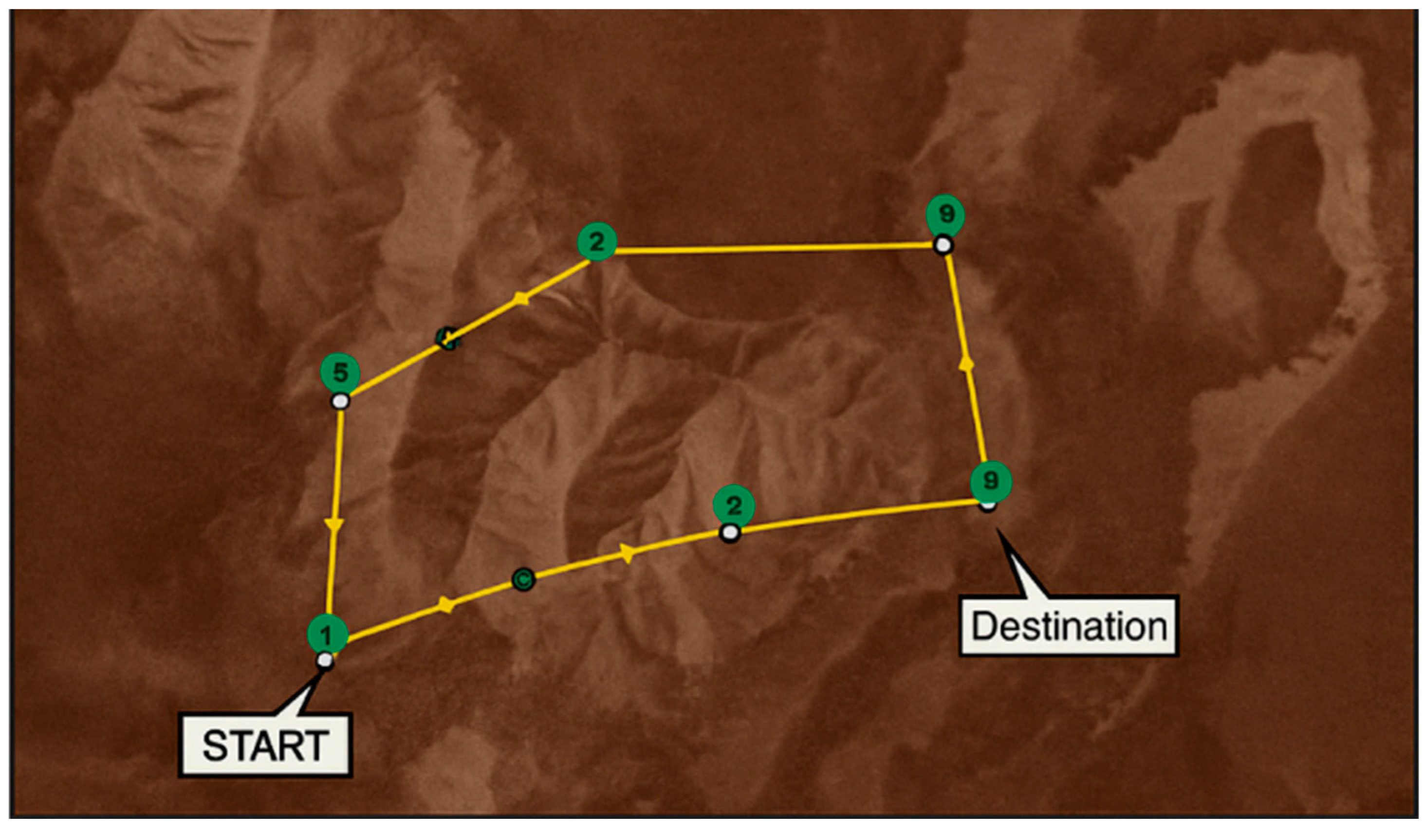 The flight plan is shown in Figure 8 with the starting point and destination indicated. The STM32 microcontroller equipped with an ARM Cortex-M3 running at 72 MHz is capable of efficiently handling the computational tasks of the improved RRT algorithm. Its computational speed is 1.25 DMIPS/MHz, and the power consumption is approximately 20–40 mA at full speed (72 MHz) with the operating voltage 3.3 V. Compared with other microcontrollers, it maintains a low power consumption, making it attractive for requiring long term operation. This makes STM32 an ideal choice for a mission planning system with both excellent computing speed and energy efficiency.