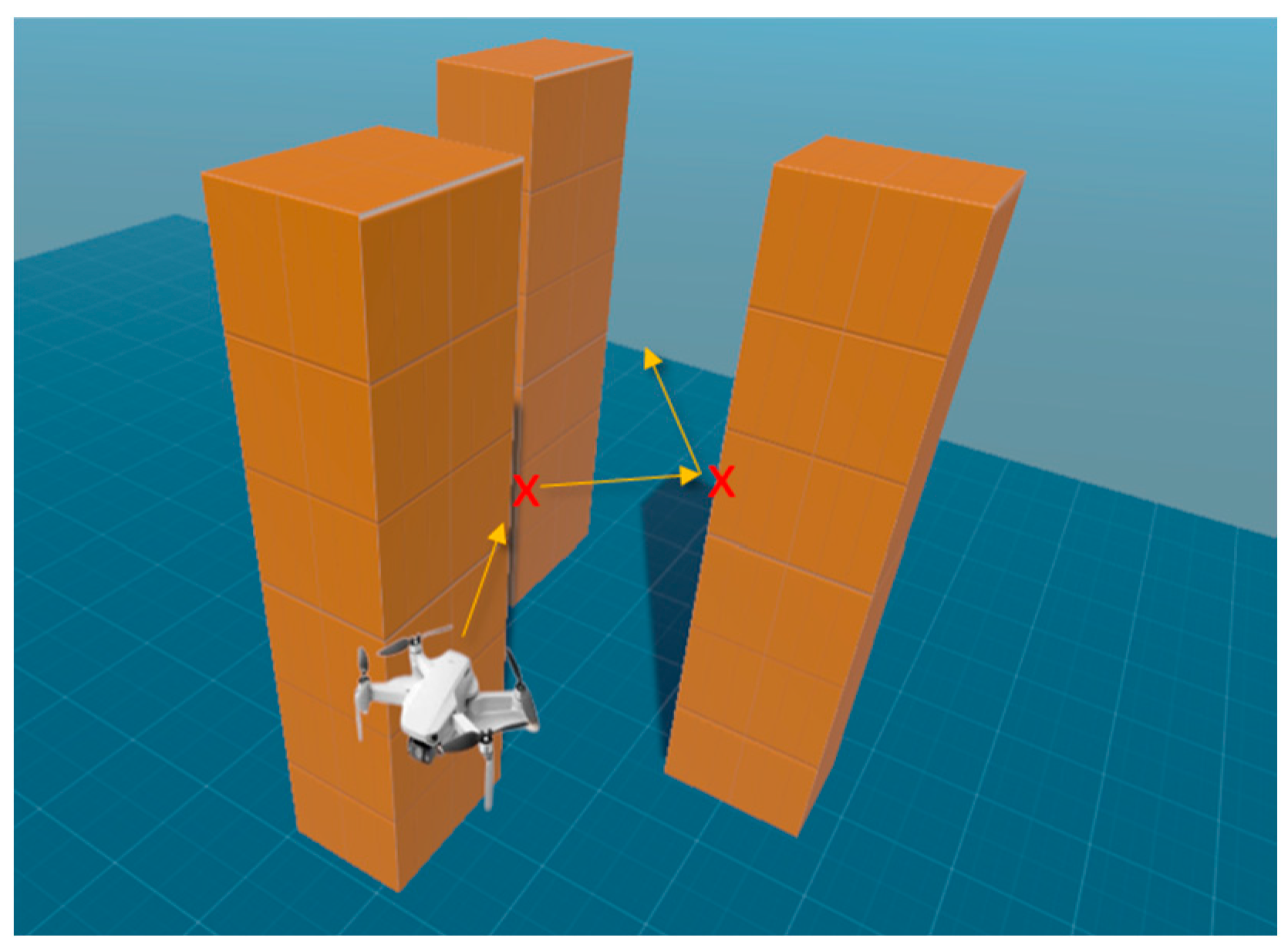 Figure 9. Schematic diagram of flying at a fixed altitude while avoiding ground obstacles in the Unity-based 3D environment. The yellow arrows indicate the UAV’s projected trajectory on the horizontal plane used for 2.5D path planning, whereas the red “×” marks denote unsafe candidate paths that would intersect the obstacles and are therefore rejected by the planner.