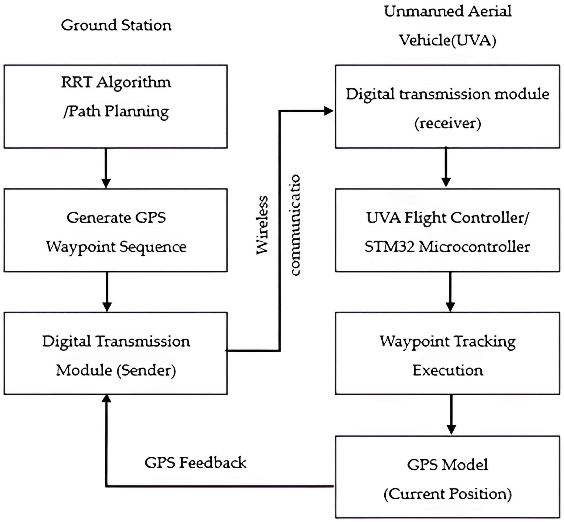This study adopts a hierarchical architecture for navigation and control, as illustrated in Figure 10. In the upper layer, path planning is performed either by the ground station or the onboard STM32 microcontroller, which computes and generates a sequence of GPS waypoints. These waypoints are then transmitted to the UAV’s lower-layer flight controller, such as an open-source autopilot based on ArduPilot or PX4. The lower-layer controller is responsible for executing position control; that is, it calculates the error between the current GPS position and the target waypoint, and automatically outputs motor commands to guide the UAV toward the designated waypoint. The core contribution of this study lies in the intelligent generation of waypoints at the upper layer rather than in the design of the lower-layer controller.