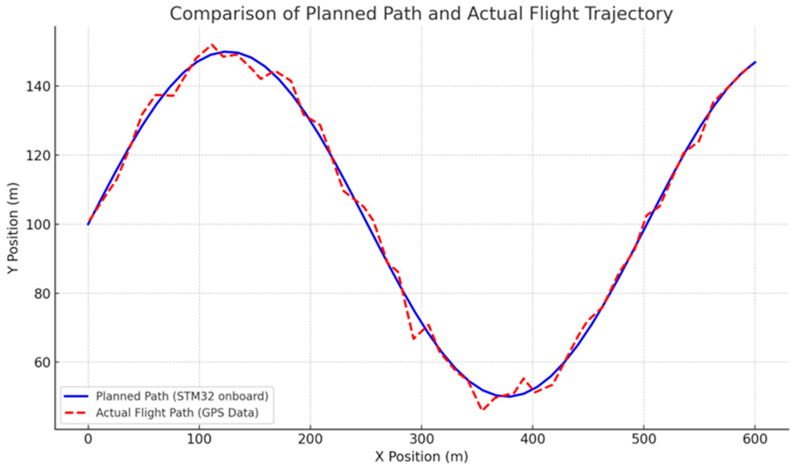 Figure 11. Comparison between the planned path (blue line) generated by the onboard STM32 and the actual flight trajectory (red line) recorded from GPS data during the validation flight.