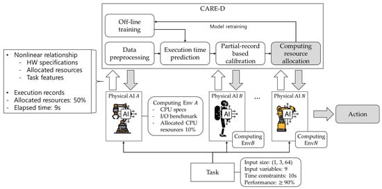 System overview of CARE-D in a physical AI resource management loop, where execution time predictions are used to select computing resources for physical AI tasks.
